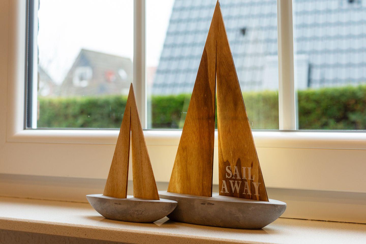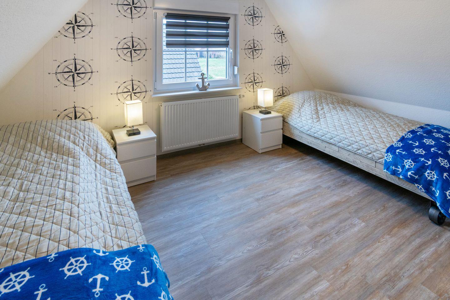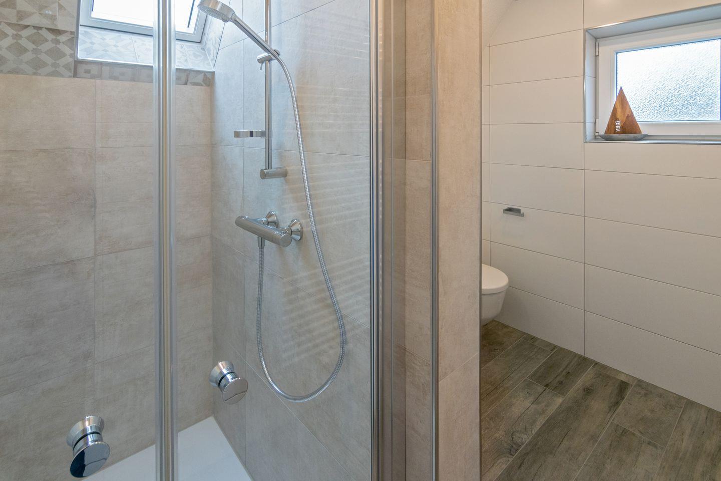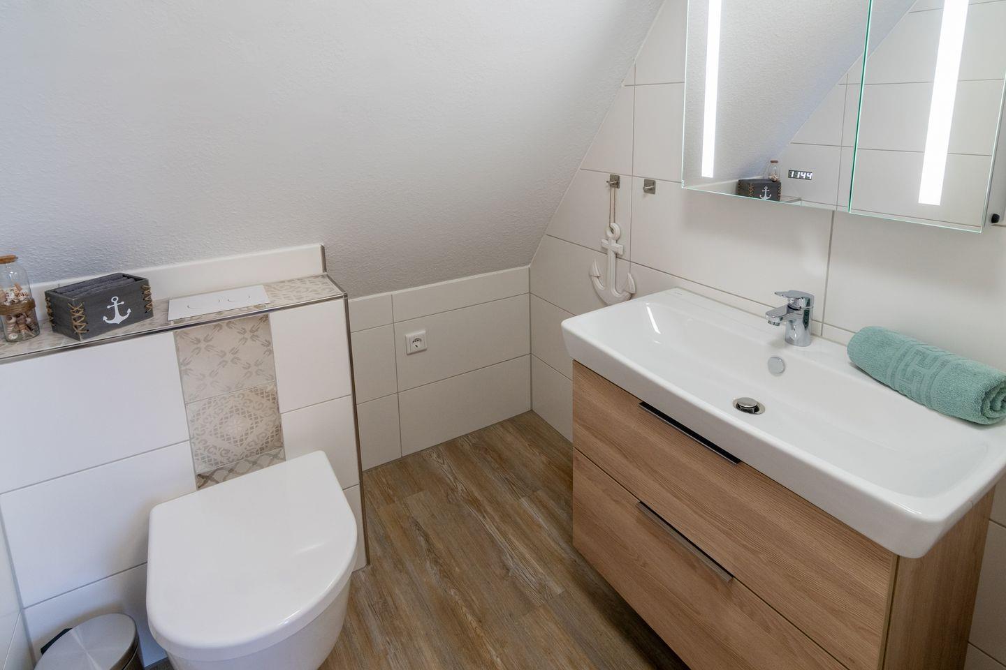 Das Badezimmer ist hell und modern gestaltet, verfügt über eine bodengleiche Dusche, Waschbecken, WC und ein Fenster. Zusätzlich ist ein Gäste-WC vorhanden, was besonders bei voller Belegung zusätzlichen Komfort bietet. Für die Jüngsten stehen ein Treppengitter, ein Kinderhochstuhl sowie ein Babybett zur Verfügung. Zudem gibt es zwei Zustellbetten, sodass sich die Unterkunft flexibel den Bedürfnissen kleiner Familien anpasst. Kinder sind im Muschelsammler ausdrücklich willkommen.