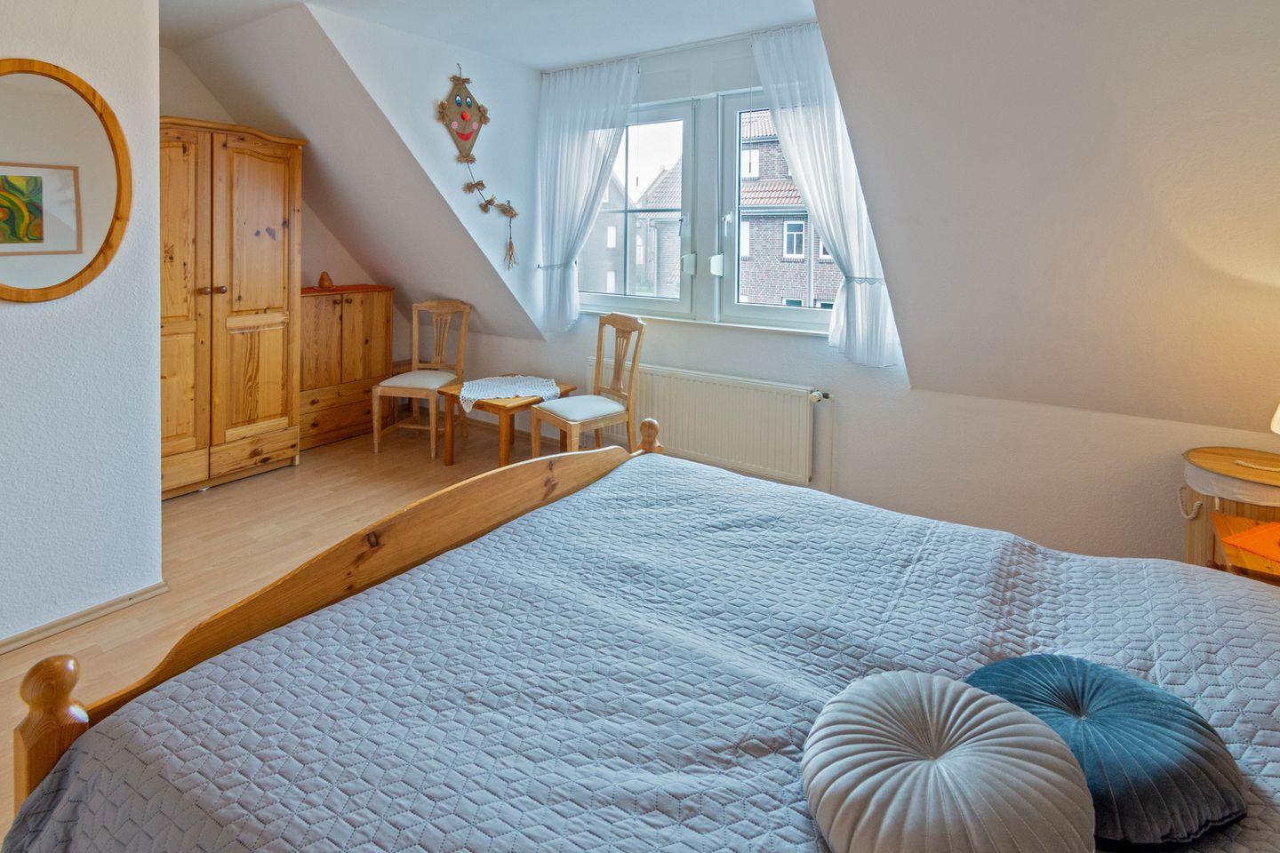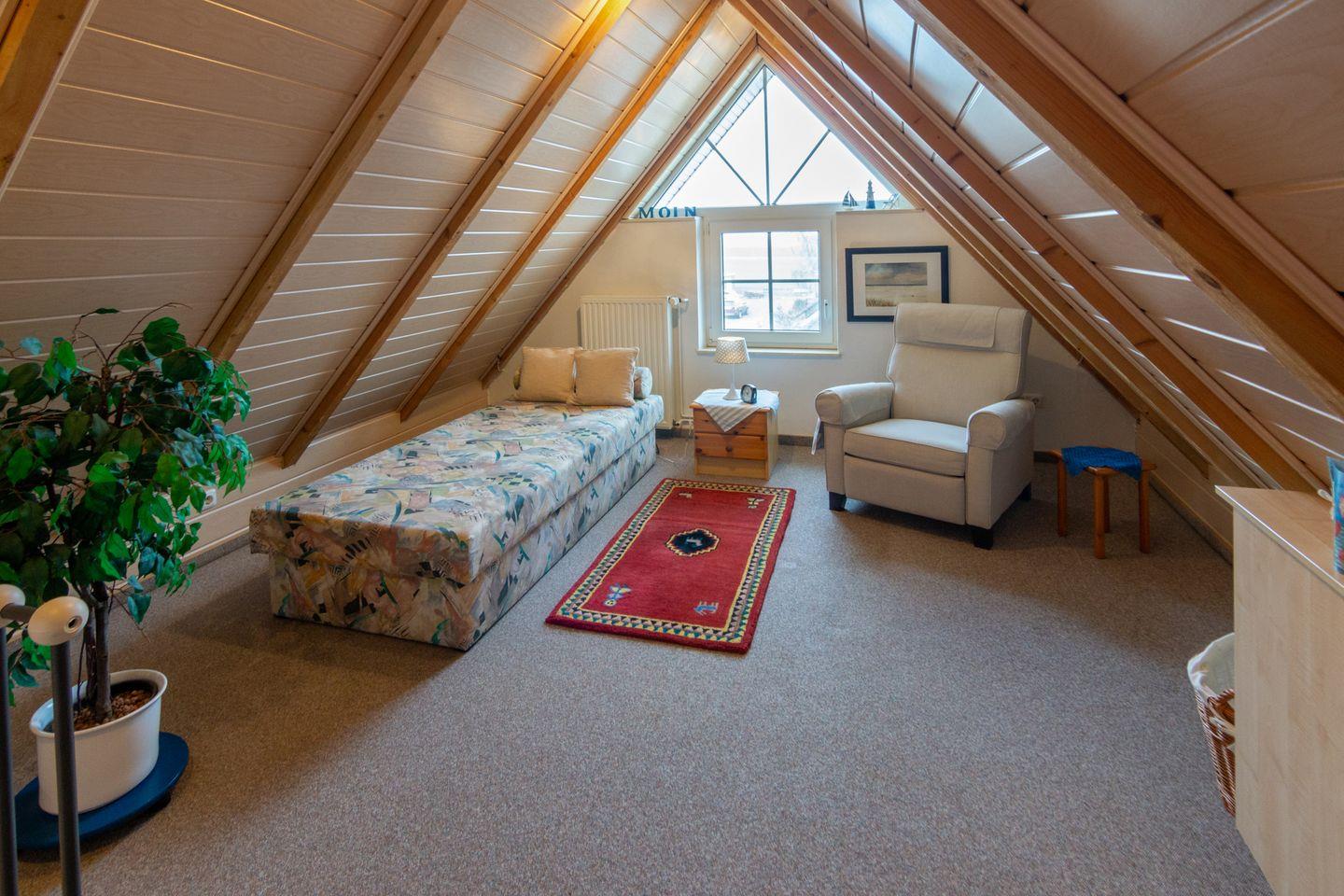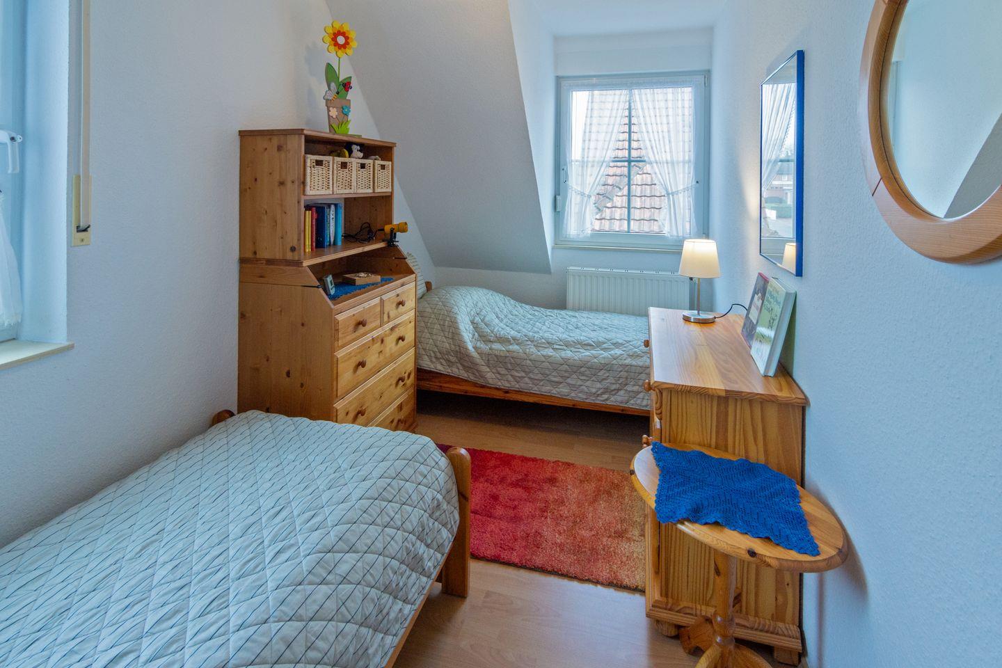 Im Erdgeschoss befindet sich der großzügige Wohn- und Essbereich, eine voll ausgestattete Küche sowie ein modernes Duschbad mit WC. Im Obergeschoss finden Sie zwei komfortable Schlafzimmer – eines mit einem Ehebett und eines mit zwei Einzelbetten. Zusätzlich gibt es ein weiteres Duschbad mit WC. Über eine platzsparende Raumspartreppe gelangen Sie von einem der Schlafzimmer in ein weiteres Zimmer ohne Tür, das mit einem Schlafsofa ausgestattet ist und zusätzlichen Schlafraum bietet.