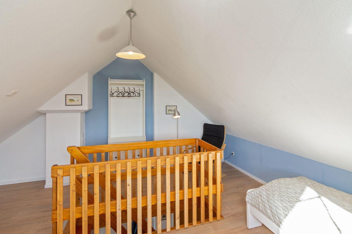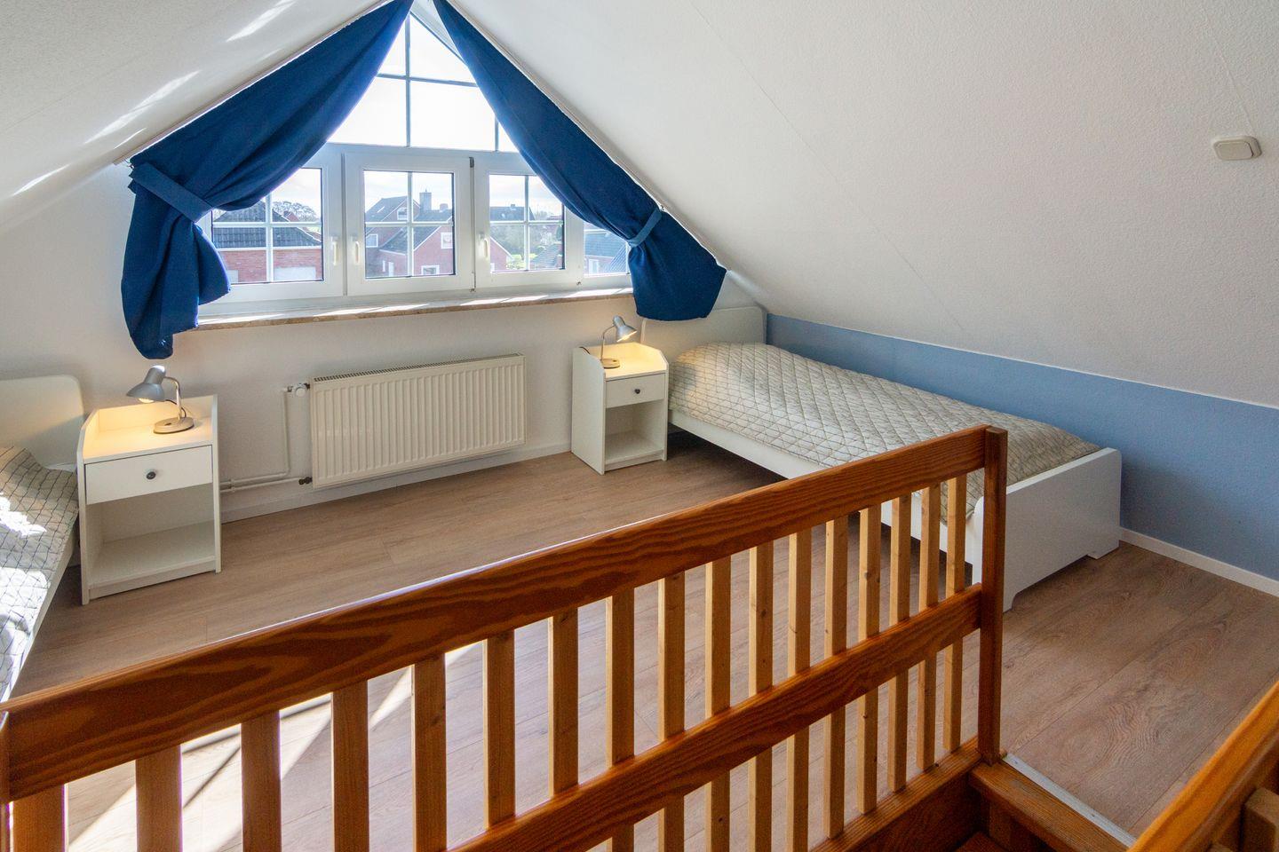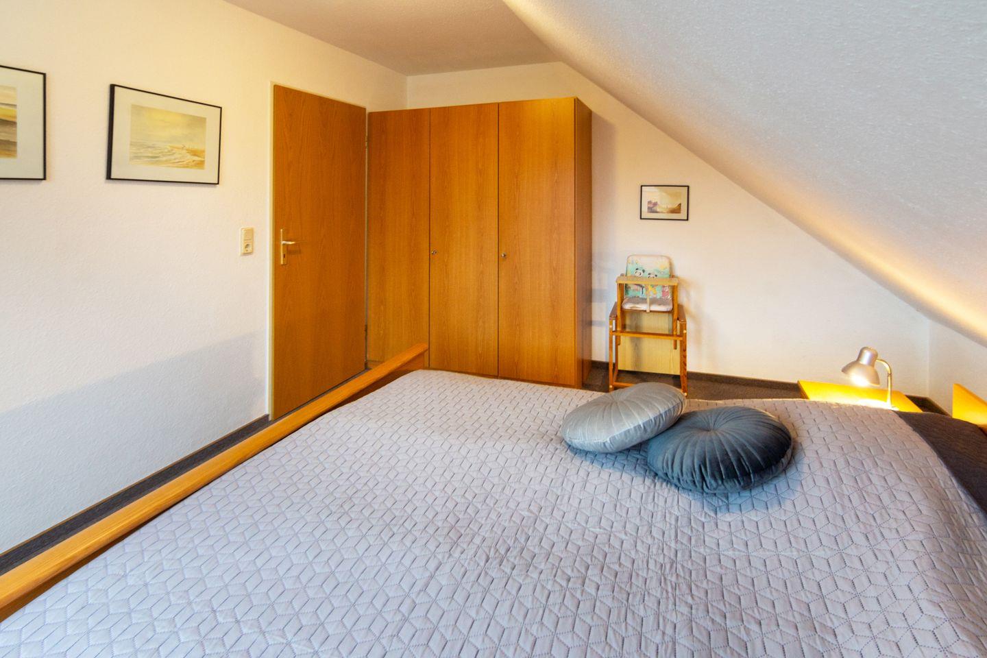 Im Obergeschoss erwartet Sie ein stilvoll eingerichtetes Schlafzimmer mit einem komfortablen Ehebett. Ein weiteres Schlafzimmer mit zwei Einzelbetten befindet sich im ausgebauten Dachgeschoss, das über eine platzsparende Raumspartreppe erreichbar ist. Hier können besonders Kinder oder Jugendliche ihre eigene Rückzugsmöglichkeit genießen.