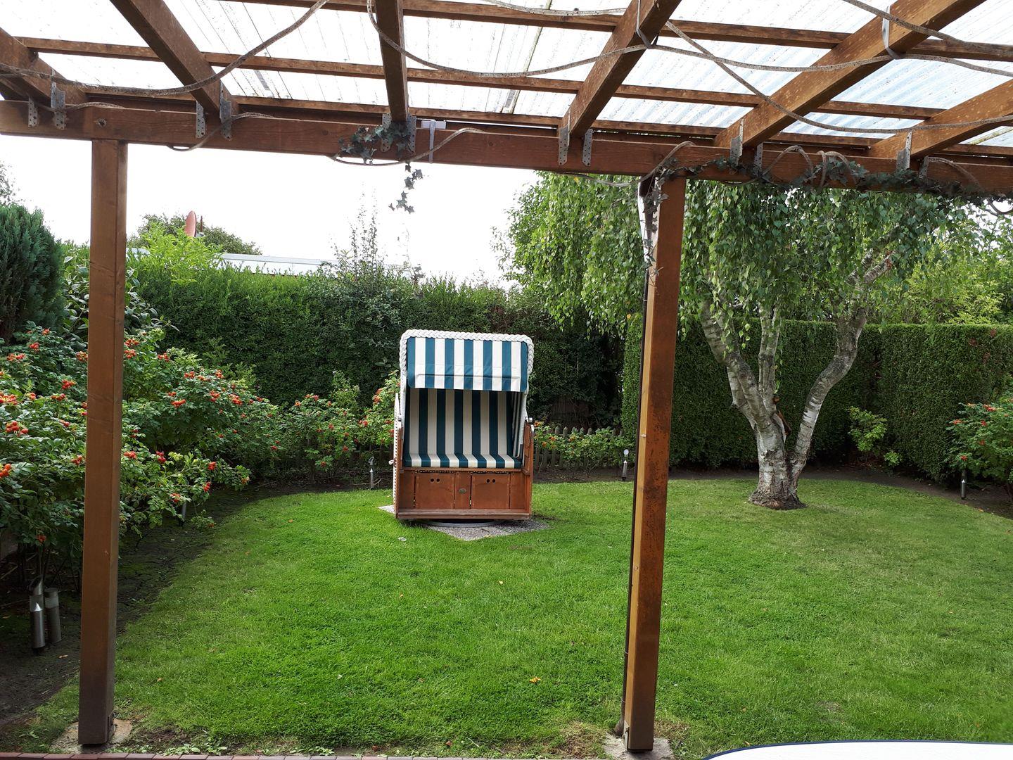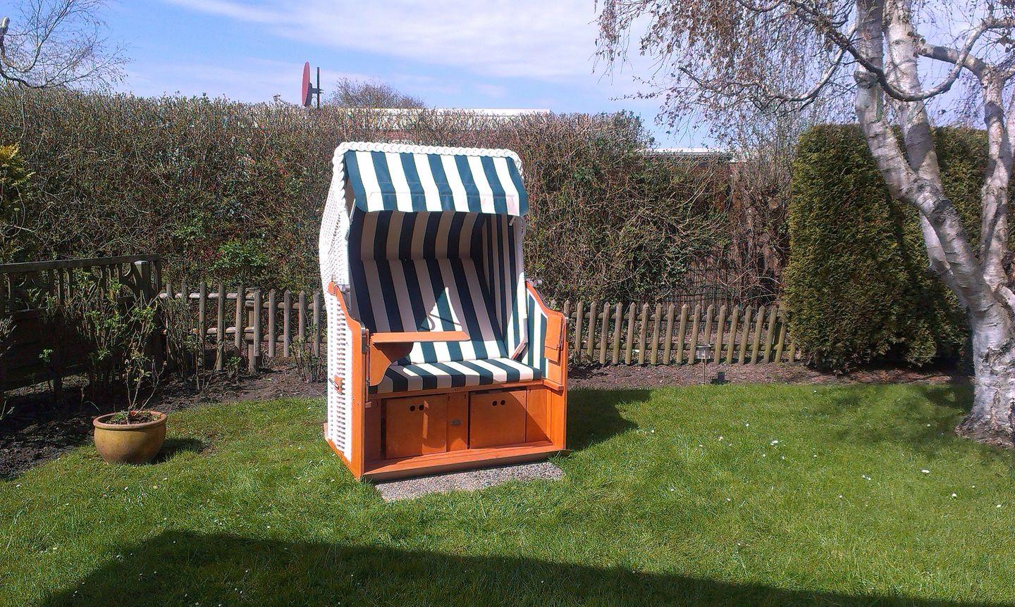 Ein Highlight ist die große, möblierte Terrasse mit Strandkorb und Zugang zum eingezäunten Garten – ideal zum Sonnen, Spielen und Entspannen an der frischen Luft.