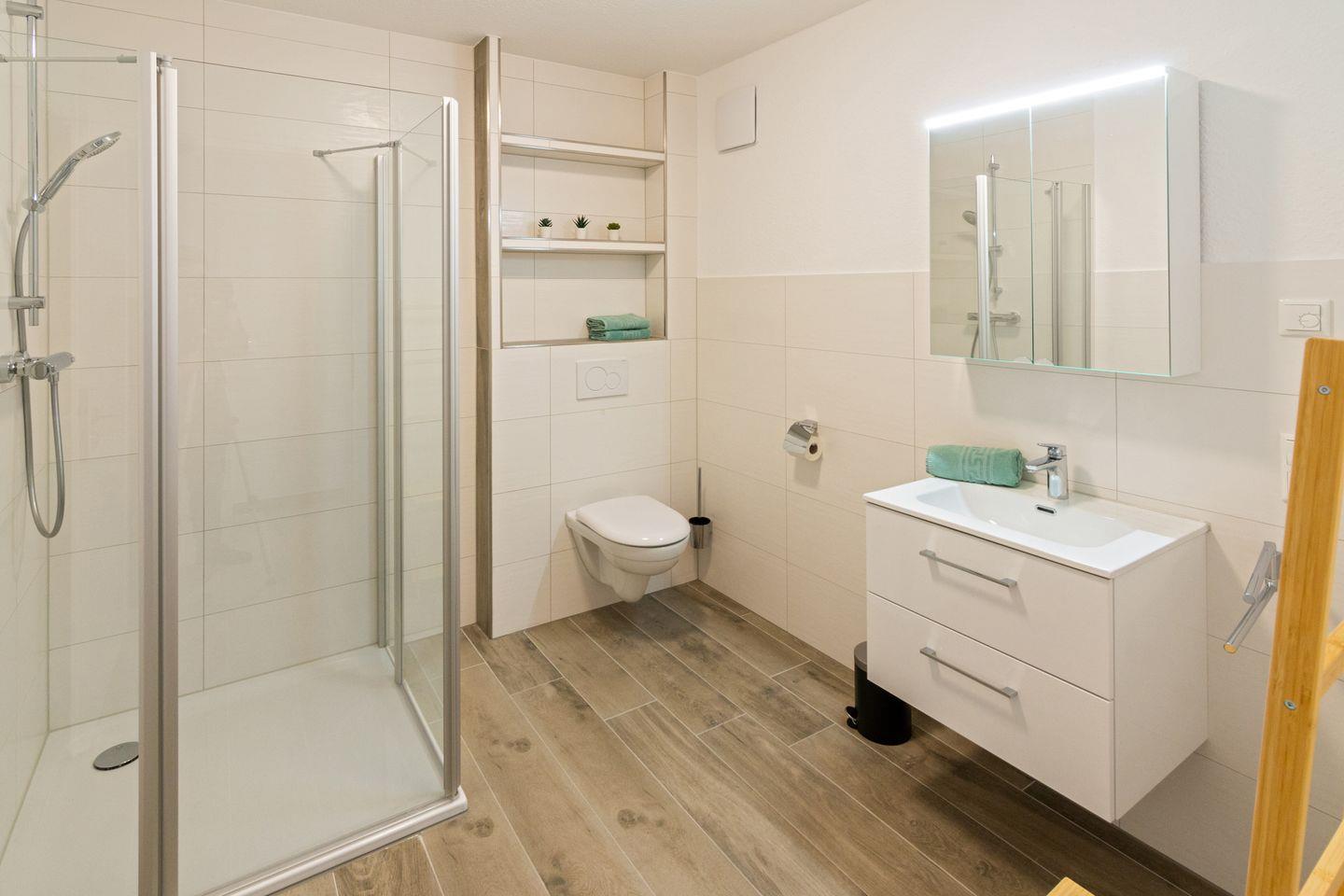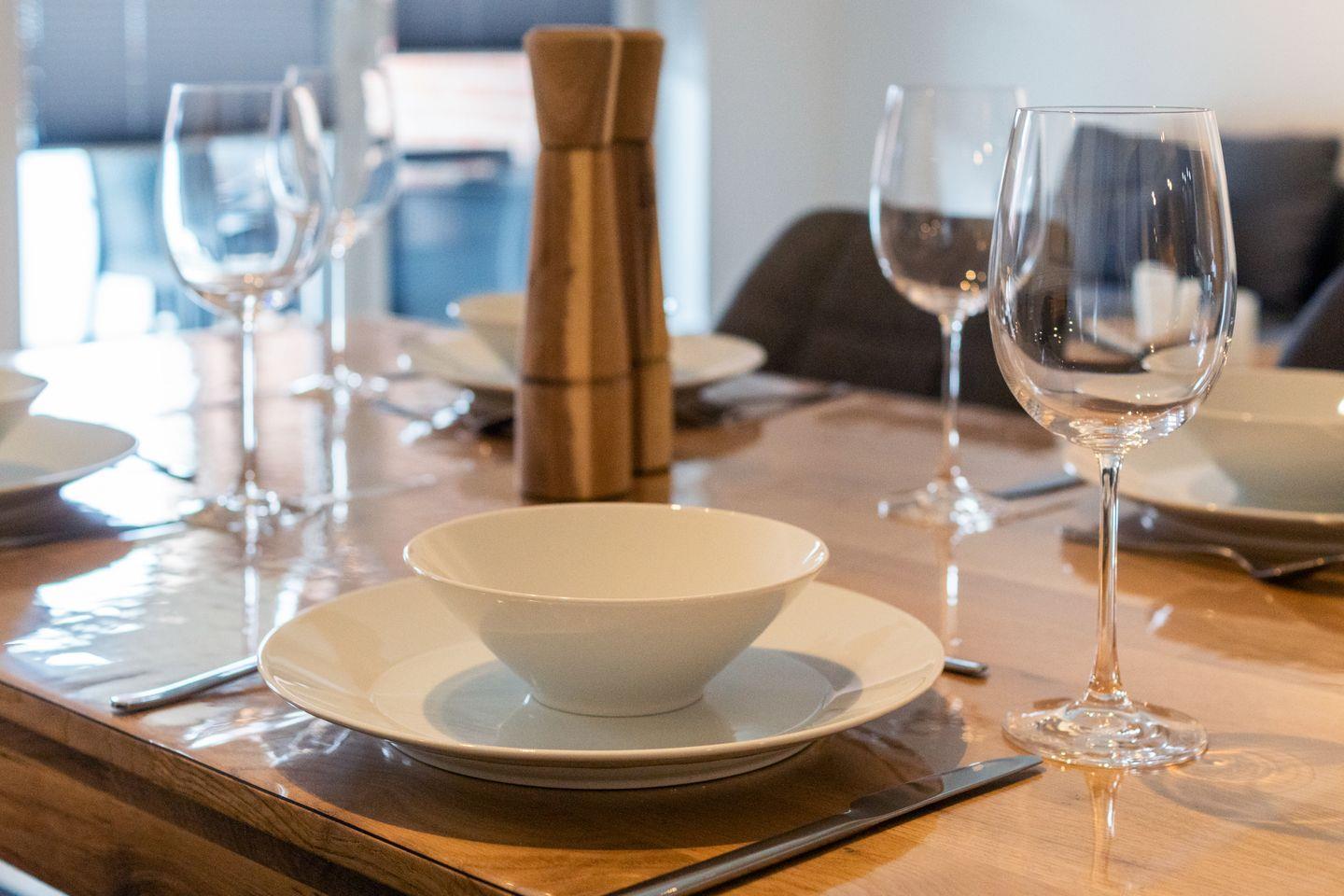 Die lichtdurchflutete Wohnung im ersten Stock überzeugt durch eine freundliche Atmosphäre und Fußbodenheizung. Im Wohnzimmer erwarten Sie ein gemütliches Sofa sowie ein TV mit Satellitenanschluss – ideal für entspannte Abende. Die Küche ist mit Induktionsherd, Backofen, Kühlschrank, Spülmaschine und Kaffeemaschine ausgestattet. Am Esstisch genießen Sie Ihre Mahlzeiten in geselliger Runde.