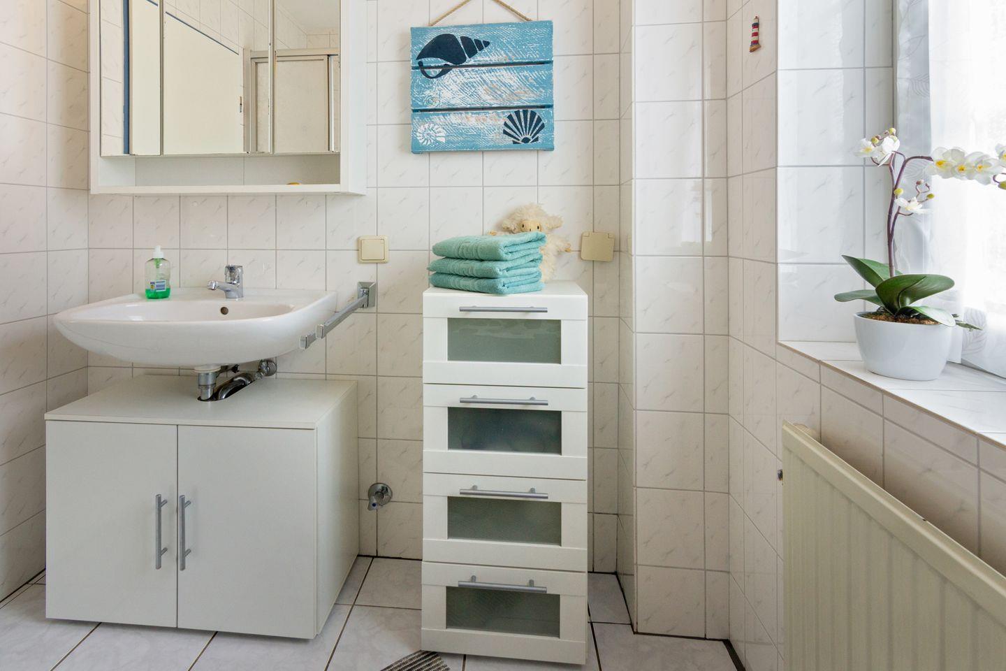Das Badezimmer verfügt über Dusche, WC, Waschbecken und Föhn – funktional und gepflegt. Ein Highlight ist die möblierte Terrasse mit Sonnenliegen und Elektrogrill – perfekt für entspannte Stunden an der frischen Nordseeluft.
