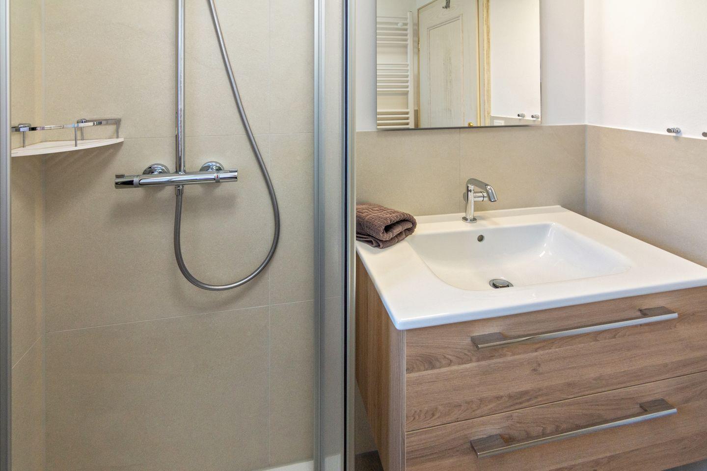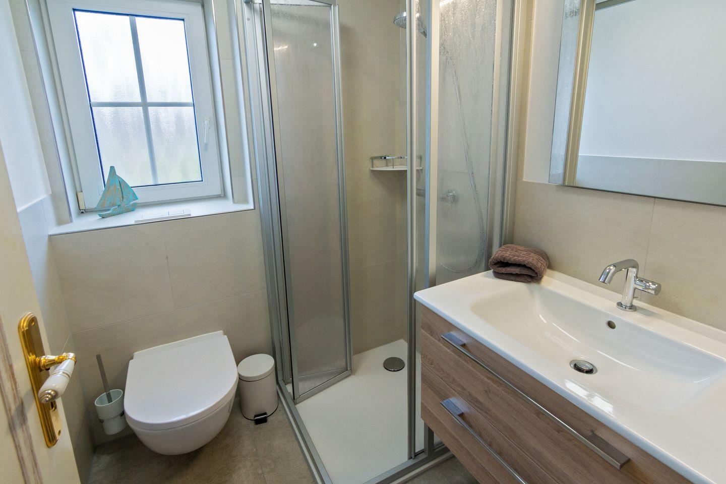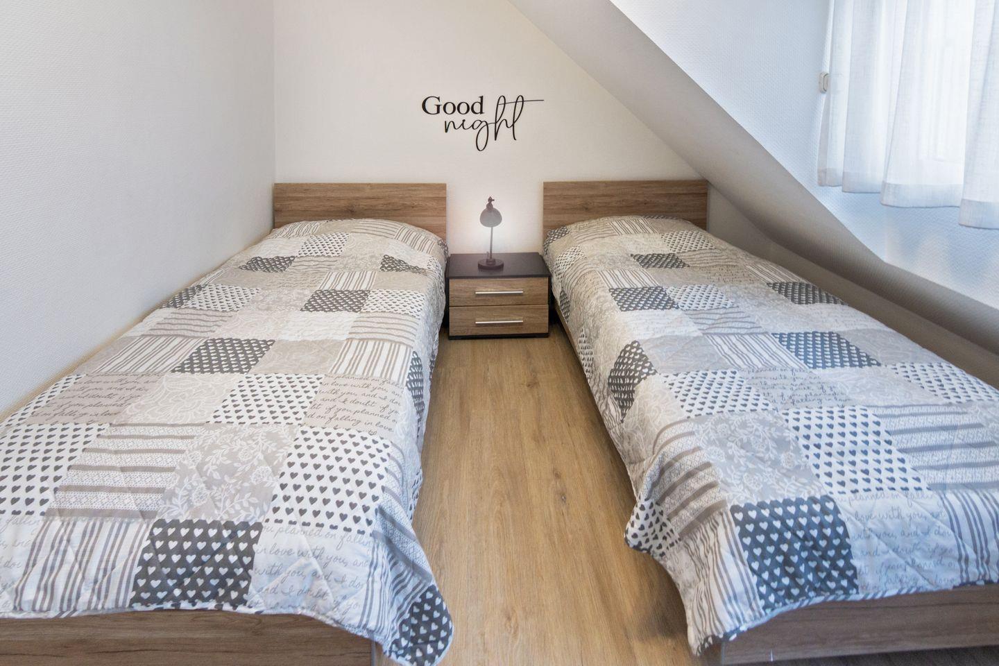 Im Obergeschoss befinden sich zwei separate Schlafzimmer mit Vinylboden und vier Schlafmöglichkeiten. Ein Schlafzimmer verfügt zusätzlich über einen Smart-TV. Ein modernes Duschbad mit WC und Fenster sowie ein Gäste-WC vervollständigen die Ausstattung.