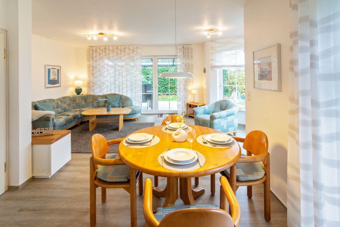 Im Erdgeschoss erwarten Sie ein gemütlicher Wohnbereich mit Sofalandschaft, Smart-TV, Zugang zur Terrasse und Garten sowie ein Essbereich. Die geschlossene Küche ist hochwertig ausgestattet – mit Ceranfeld, Backofen, Spülmaschine, Mikrowelle, Kühlschrank mit Gefrierfach, Kaffeemaschine, Toaster, Wasserkocher, Mixer und umfangreichem Kücheninventar. Waschmaschine, Wäscheständer, Bügelbrett und ein Elektrogrill sind ebenfalls vorhanden.