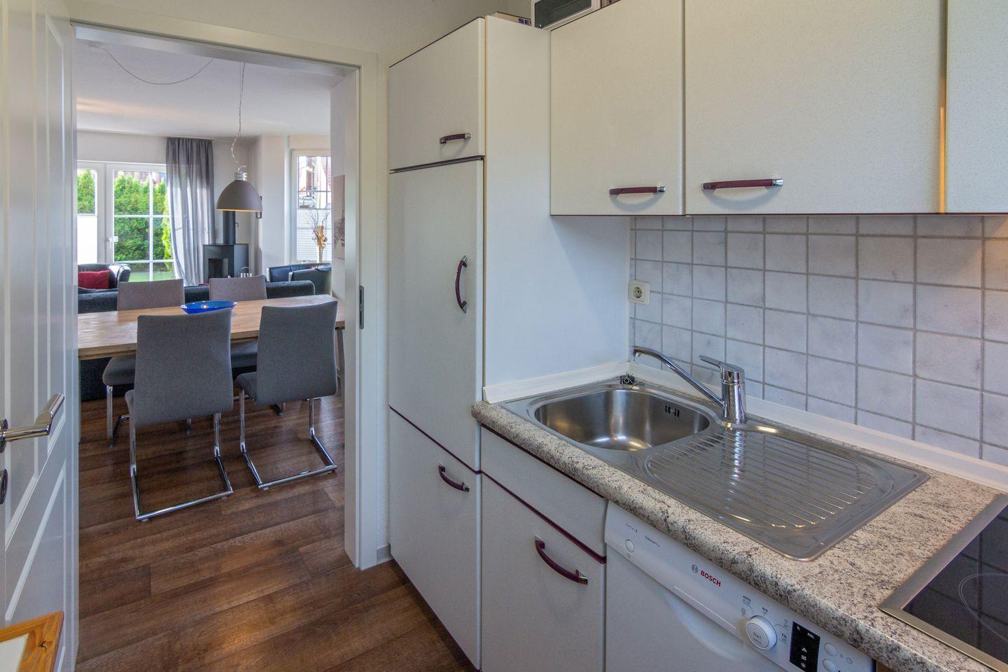 Die voll ausgestattete Küche bietet Ceranherd, Backofen, Mikrowelle, Spülmaschine, Kühlschrank mit Gefrierfach, Kaffeemaschine, Senseo, Toaster, Mixer und Wasserkocher. Im angrenzenden Essbereich können gemeinsame Mahlzeiten genossen werden.