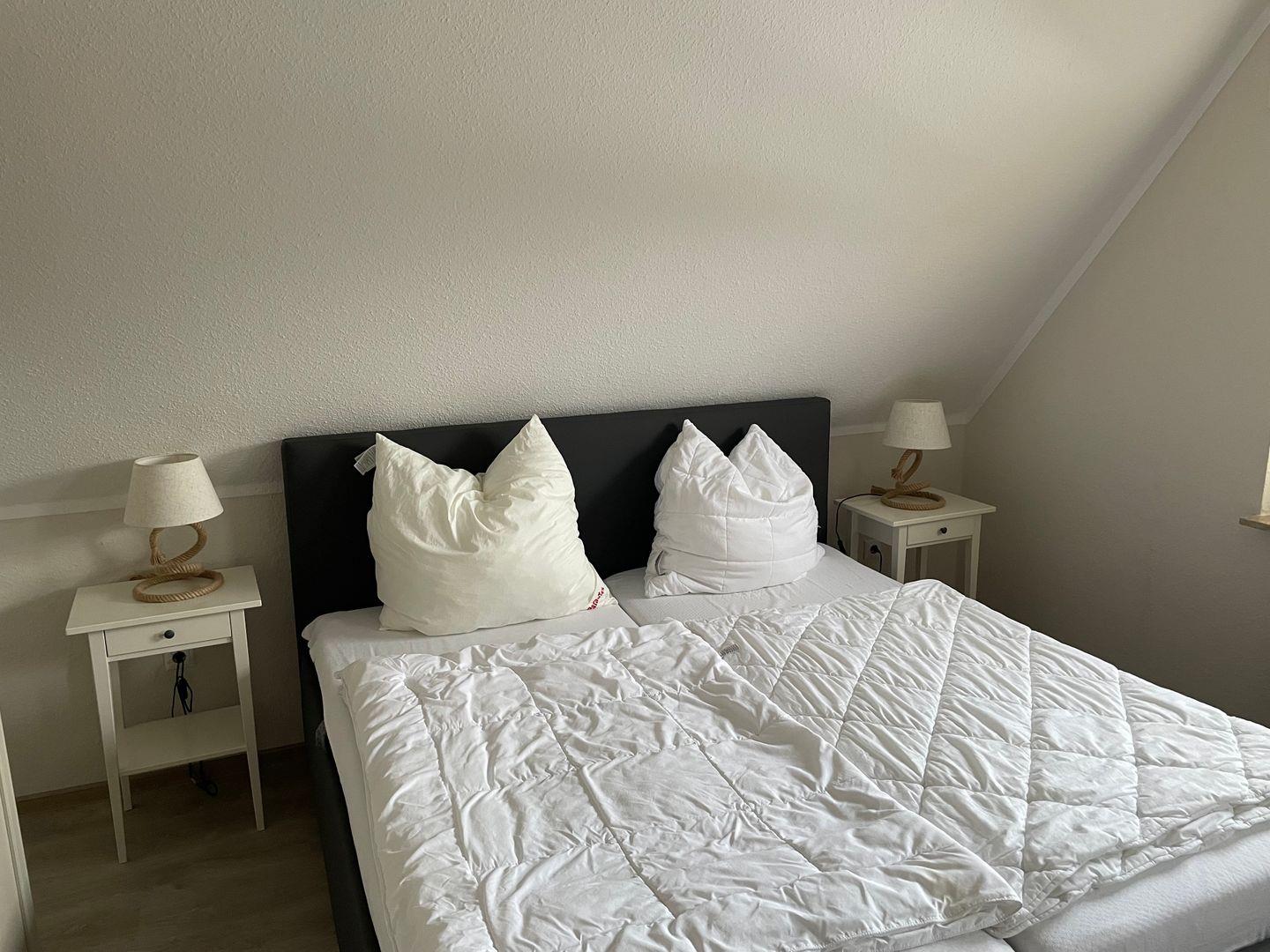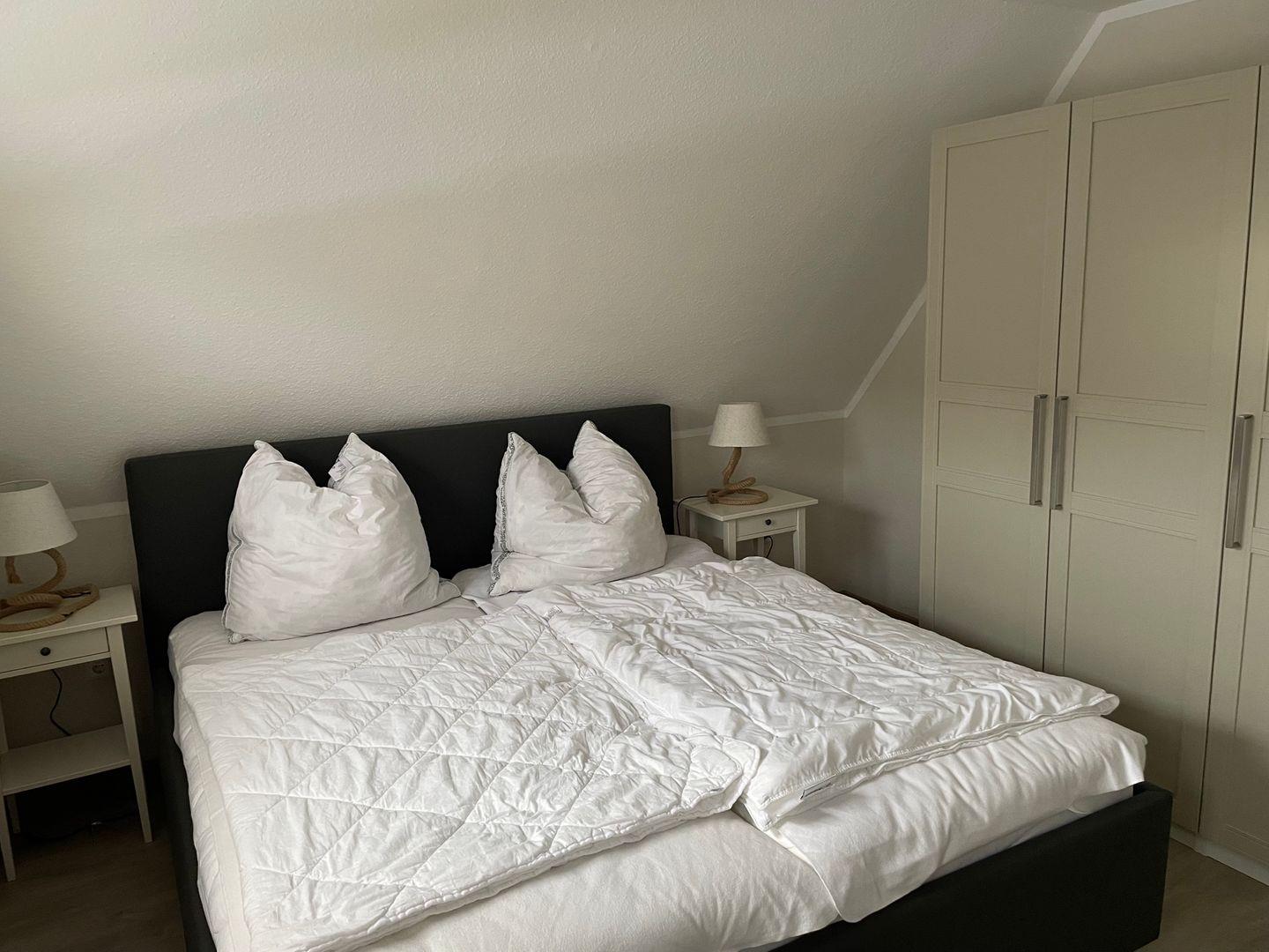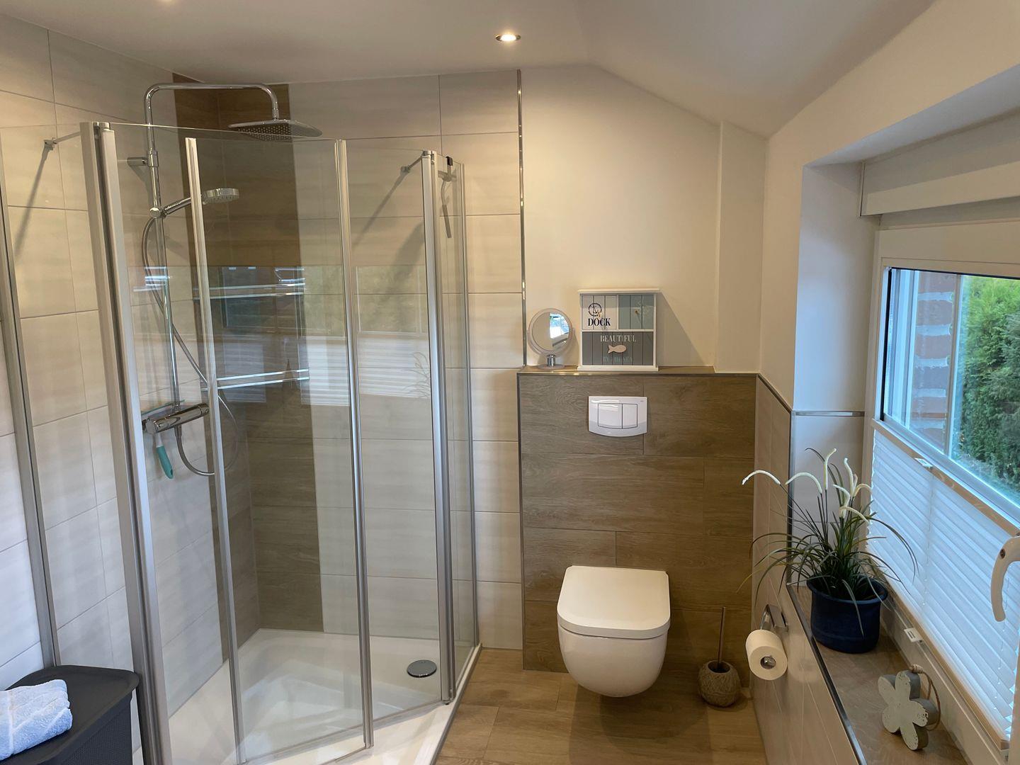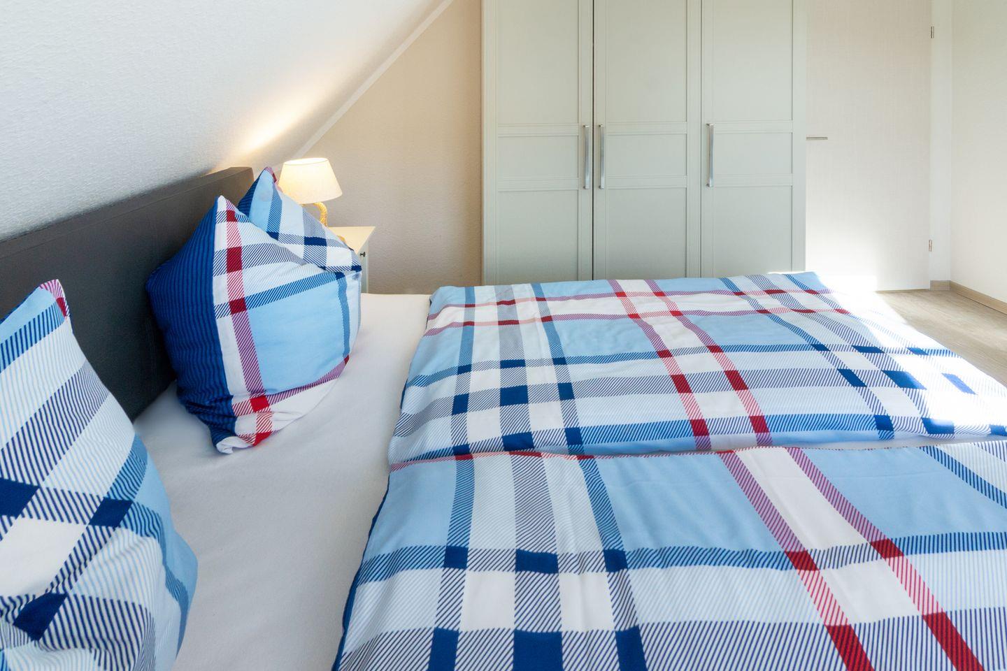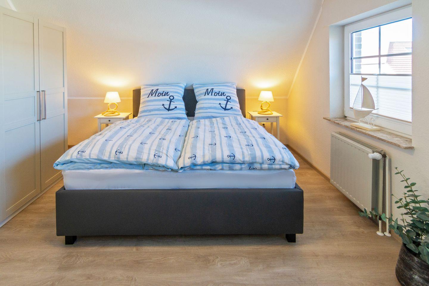Das Haus bietet zwei Schlafzimmer mit insgesamt fünf Schlafplätzen sowie ein modernes Bad mit bodengleicher Dusche und Fenster. Zusätzlich ist ein Gäste-WC vorhanden. Waschmaschine, Trockner und weitere Haushaltshelfer können genutzt werden.