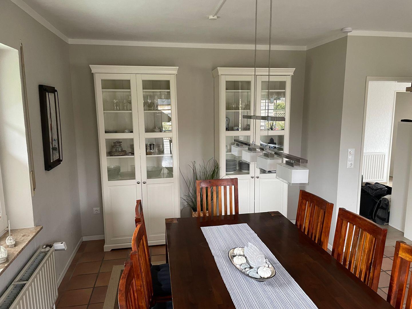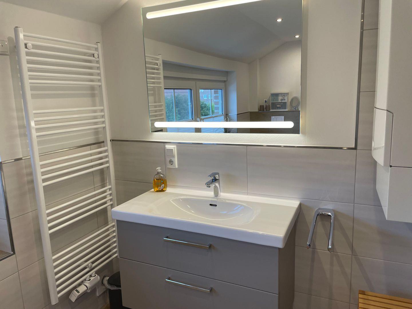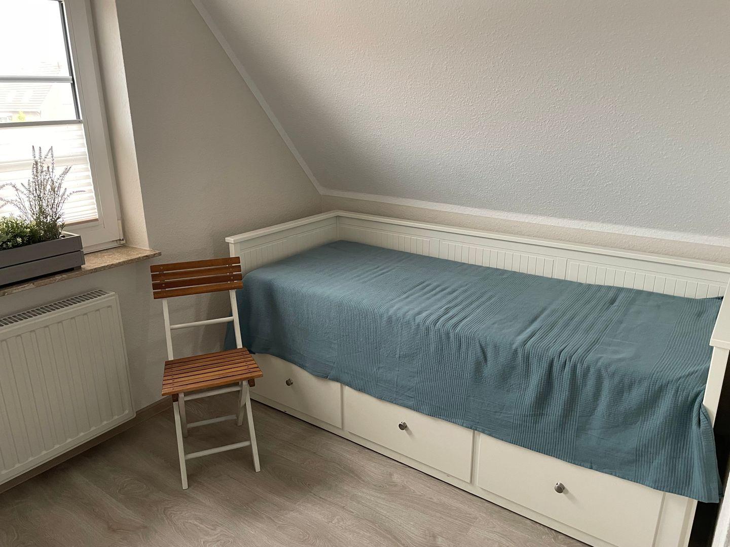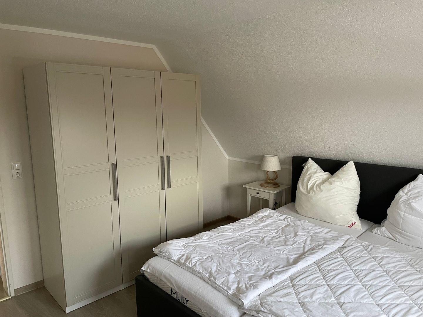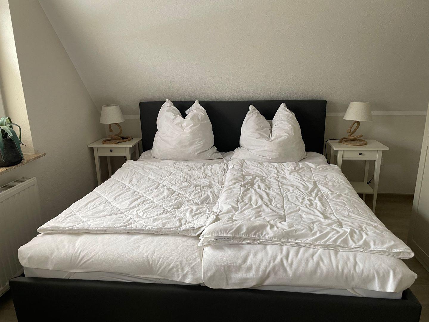 Das Haus bietet zwei Schlafzimmer mit insgesamt fünf Schlafplätzen sowie ein modernes Bad mit bodengleicher Dusche und Fenster. Zusätzlich ist ein Gäste-WC vorhanden. Waschmaschine, Trockner und weitere Haushaltshelfer können genutzt werden.