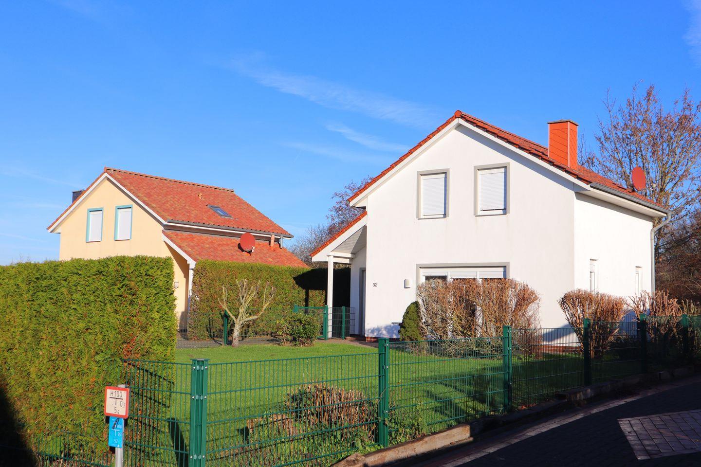 Der Garten ist komplett eingezäunt und umgeben von einer grünen Sichtschutzhecke. Hier können Sie auf der Terrasse die Sonne genießen, während die Kids auf der Liegewiese spielen oder grillen unter den Sonnenstrahlen.