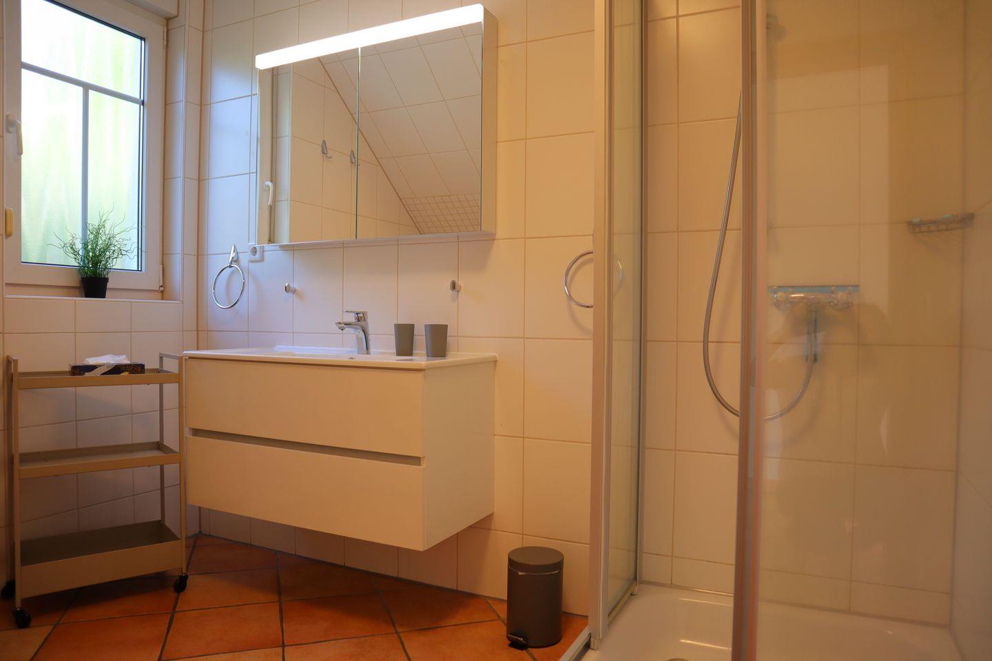 Das Ferienhaus verfügt über zwei moderne Badezimmer mit Dusche, was den Aufenthalt besonders komfortabel gestaltet. Die offene Küche, die direkt zum Wohnzimmer führt, ist mit allen notwendigen Geräten ausgestattet – vom Kühlschrank, über den Backofen bis hin zur Spülmaschine – hier zaubern Sie mühelos Ihr Lieblingsgericht. Ein großer Esstisch im Essbereich lädt zu geselligen Familienmahlzeiten ein.