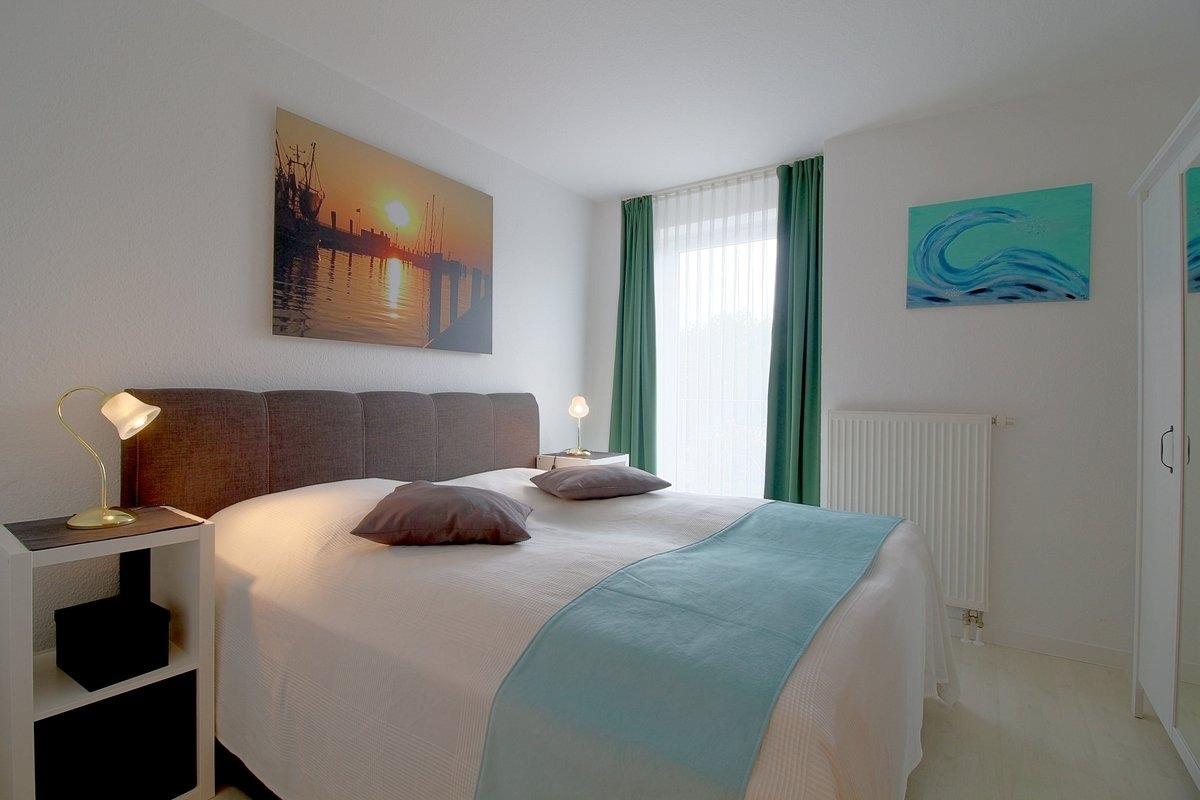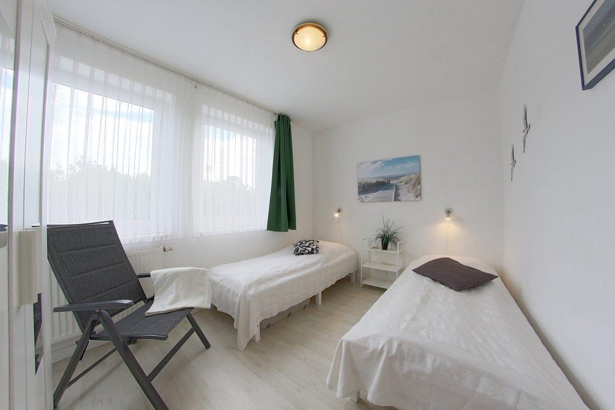 Zwei geräumige Schlafzimmer, eins mit Boxspringbett 180 x 2,00 m und eins mit 2 Einzelbetten bieten Platz für bis zu 4 Personen. Ein Babyreisebett steht ebenfalls bereit. Bettwäsche und Handtücher können dazugebucht werden.