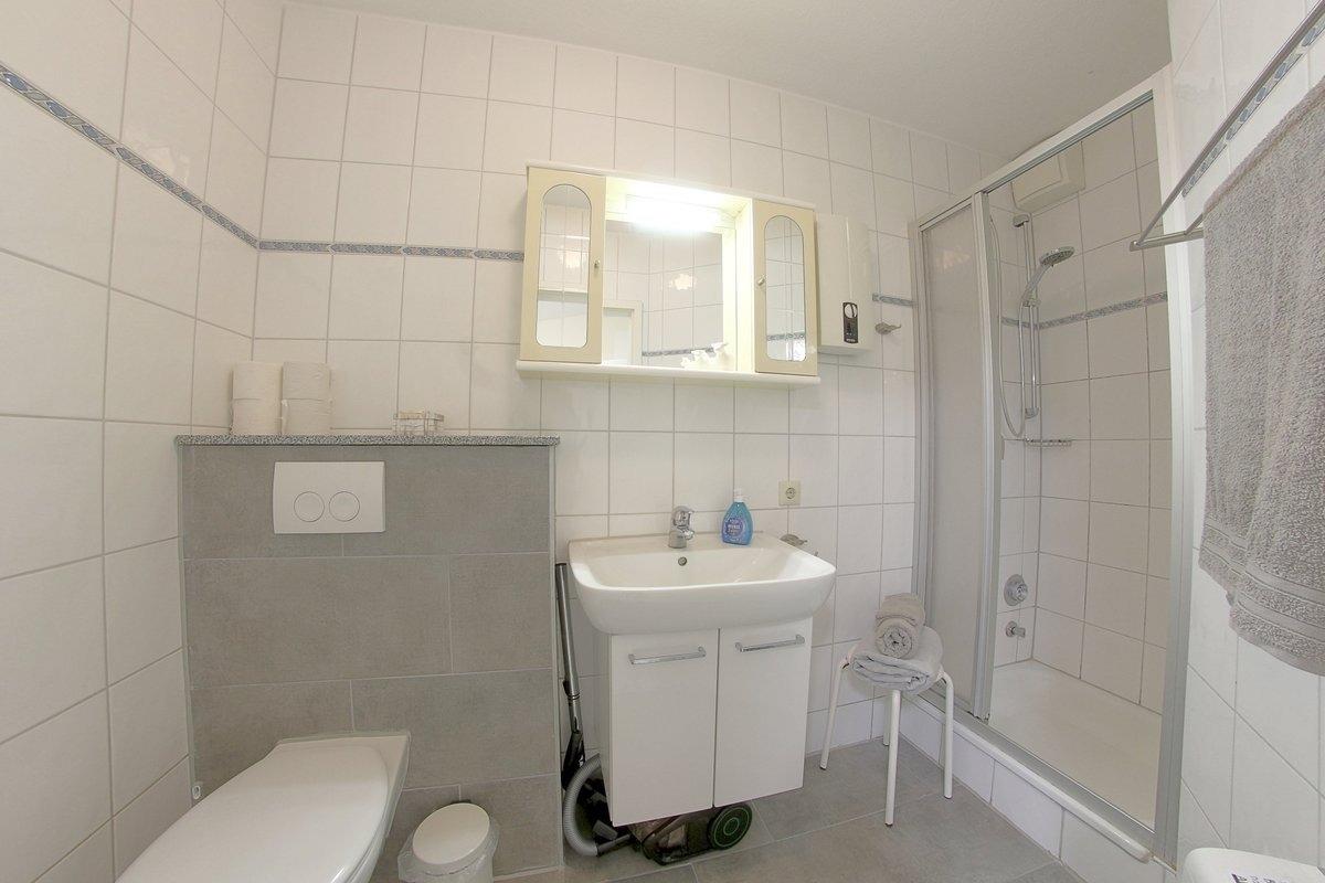 Das Duschbad ist zeitlos. Im Außenbereich gibt es einen Fahrradabstellraum[nbsp] für 2-3 Fahrräder und eigenen Parkplatz.