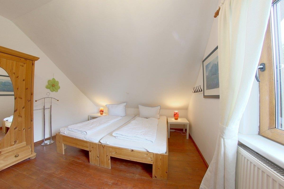 Im OG gibt es 2 weitere Schlafzimmer, eins mit Doppelbett und eins mit 2 aneinander gestellten Einzelbetten ( je 1,00 x 2,00 m ), Flachbildfernseher, Kinderbett und Verdunkelungsmöglichkeit. Ein weiteres Duschbad ist ebenfalls im OG.