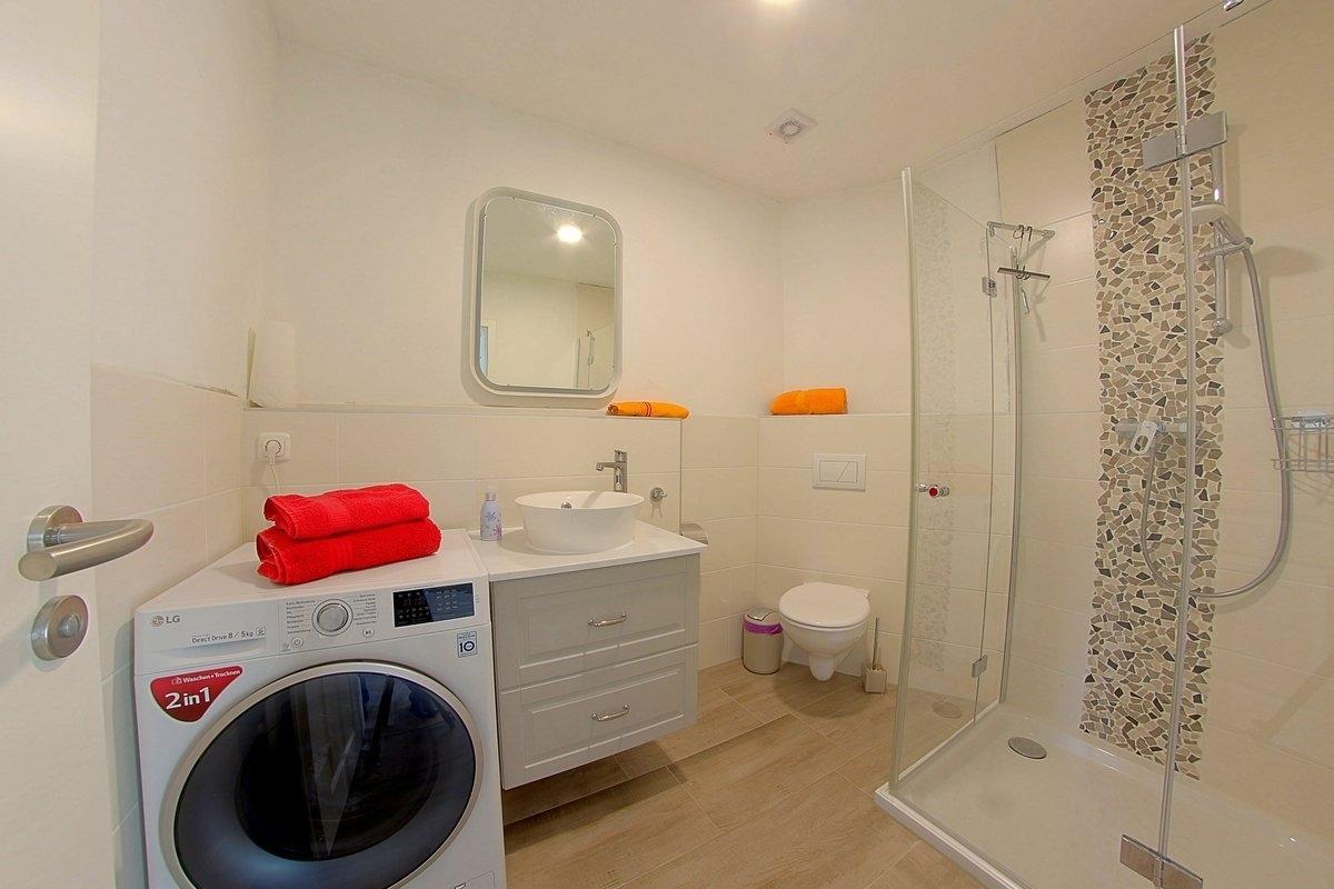 Ein helles, modernes Duschbad mit Waschtrocker steht Ihnen ebenfalls im Erdgeschoss zur Verfügung und im Obergeschoß ein separates WC.