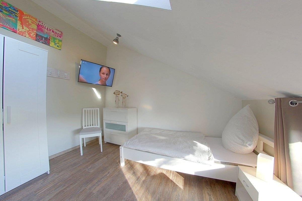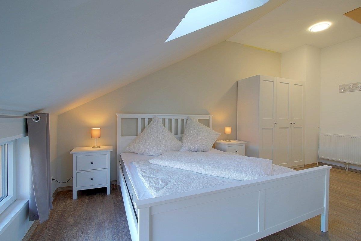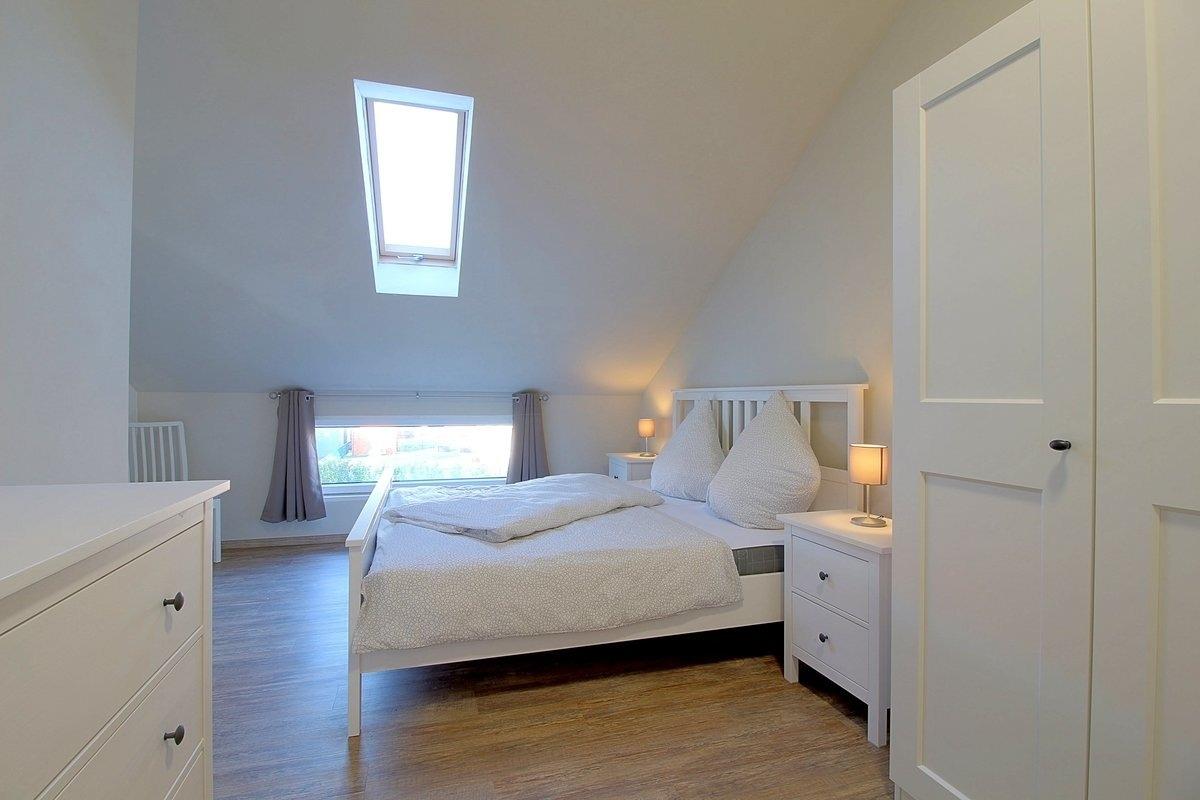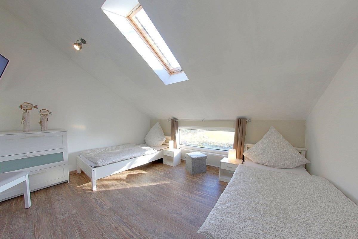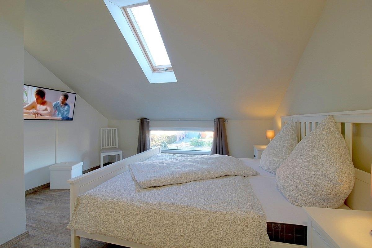 Im Obergeschoss befinden sich zwei Schlafzimmer, eins mit Doppelbett (1,80 x 2,00 m) und TV, sowie ein Schlafzimmer mit zwei Einzelbetten ( 0,90 x 2,00 m) und ebenfalls TV.