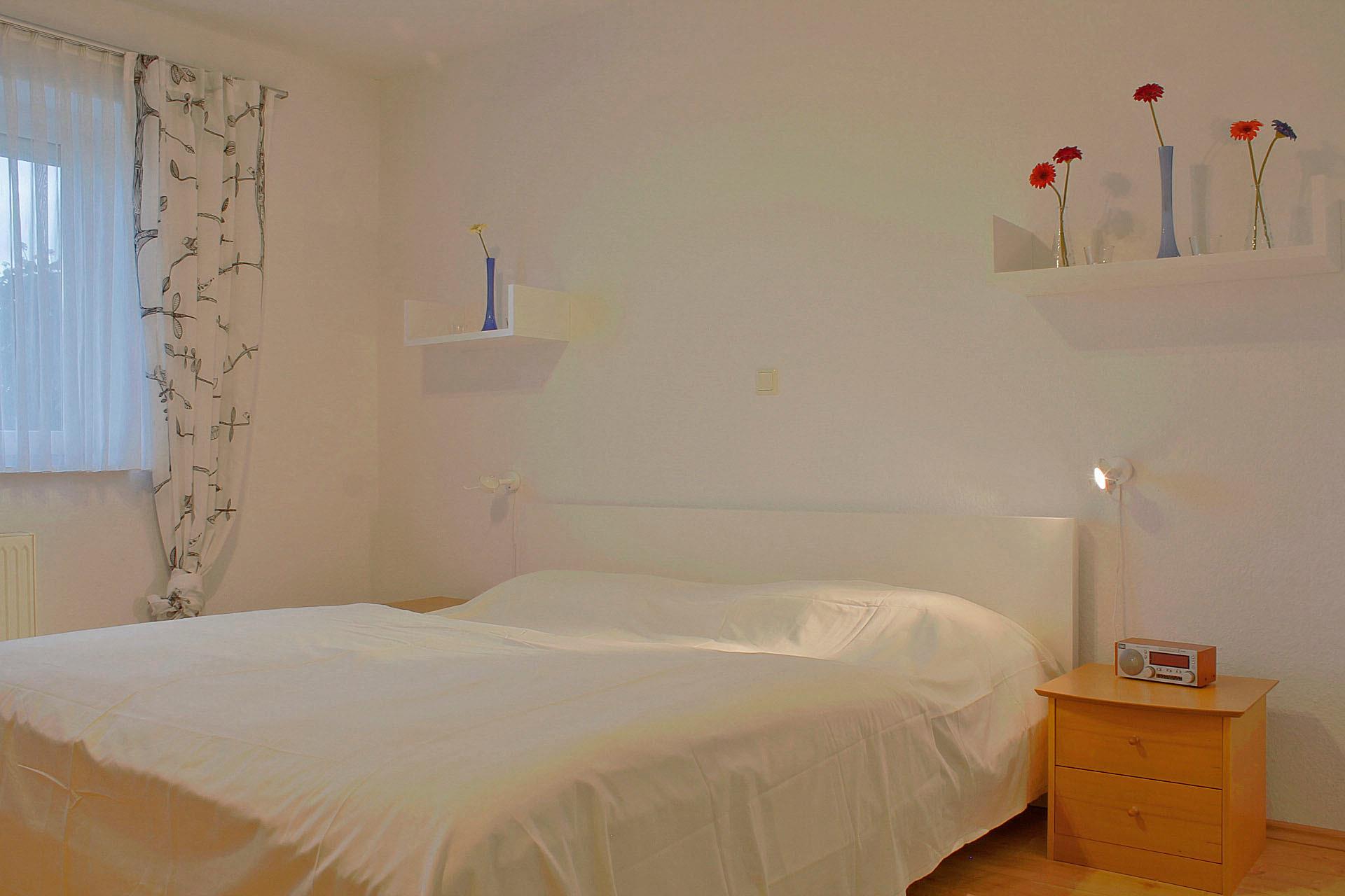 Schlafzimmer mit Doppelbett, großem Kleiderschrak, Fliegengitter, kleiner Raum unter der Treppe als Schlafbereich für ein Kleinkind mit Kinderbett, Duschbad mit Waschmaschine.