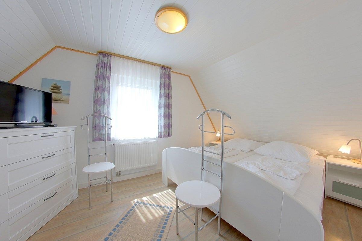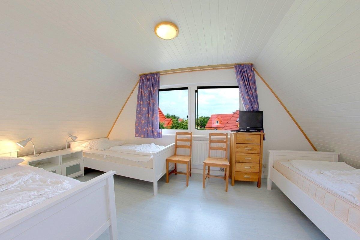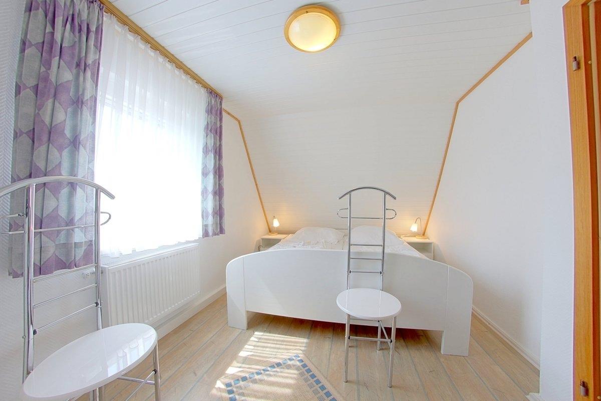 Im Erdgeschoss befinden sich der große Wohn- und Essbereich mit Kaminofen, das geräumige Bad mit Dusche/WC und Fön und ein Abstellraum. Im Obergeschoss sind 2 Schlafräume (1 Schlafraum mit Doppelbett und 1 Schlafraum mit drei Einzelbetten). Geräumige, teilüberdachte Terrasse mit großem Sonnenschirm, Gartenmöbeln und Strandkorb.