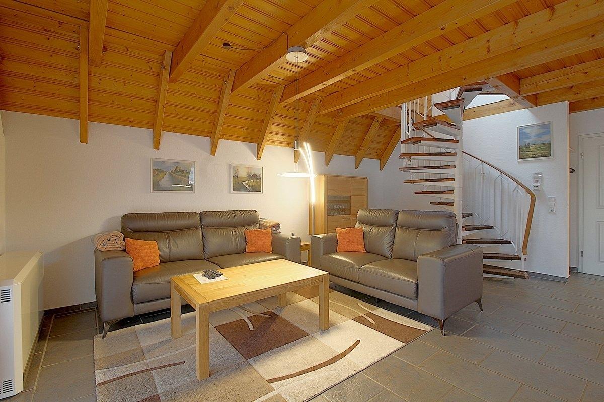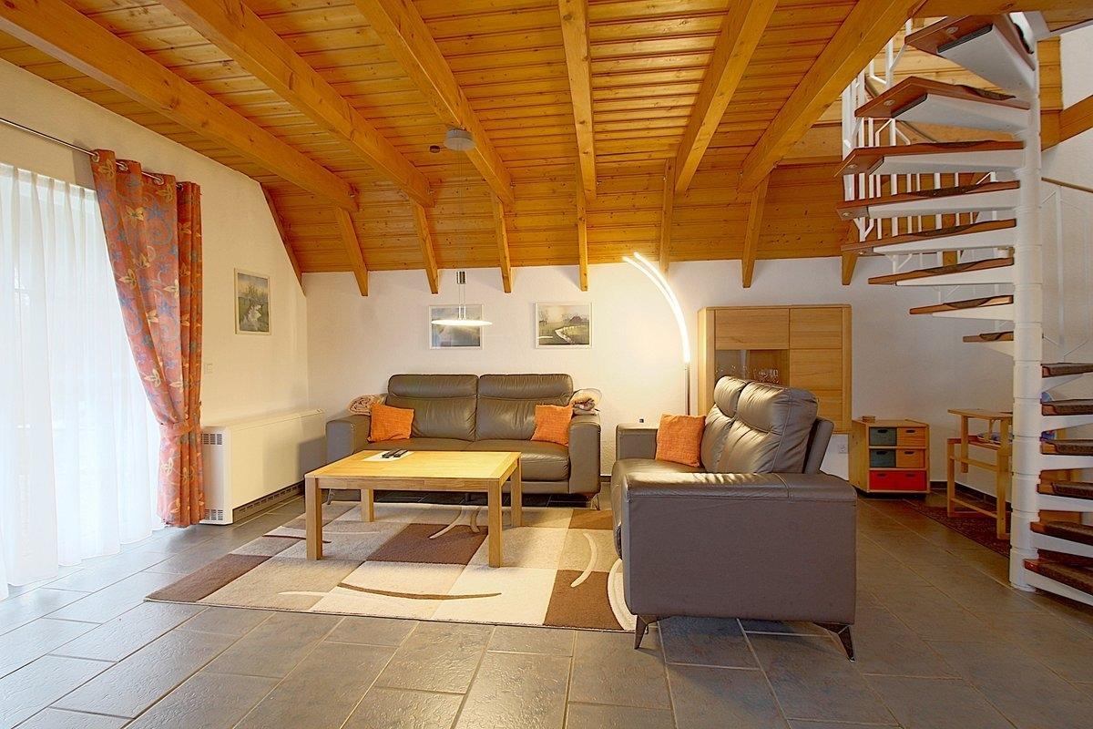 Im Erdgeschoss befindet sich der geflieste Wohnraum mit Kaminofen, Fernseher, Musikanlage, Telefon, kostenlose schnelles W-Lan mit Glasfaserkabel, Couchgarnitur sowie ein gemütlicher Essplatz. Moderne Lampen, Bilder und Gardinen sorgen für Gemütlichkeit. Kinderhochstuhl, Kinderschubladenschrank, Spiele und viele Bücher sind für die Kinder vorhanden.