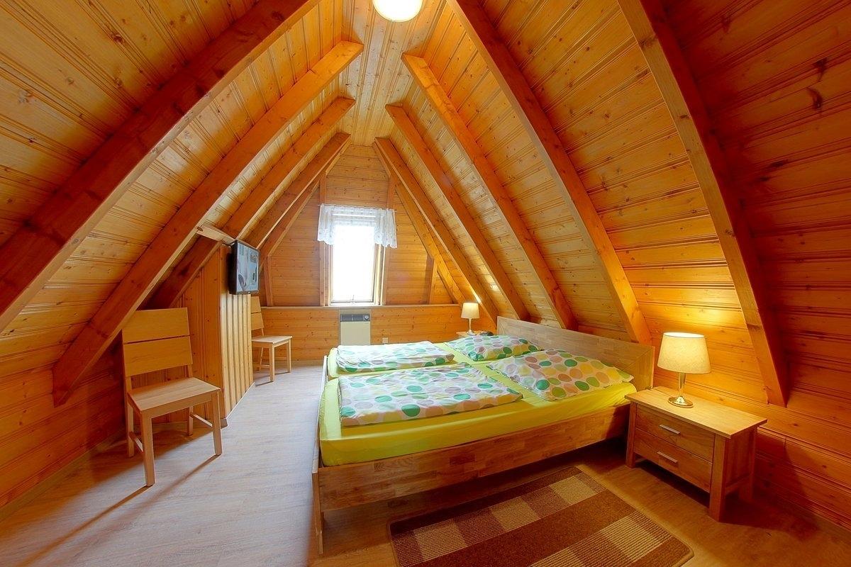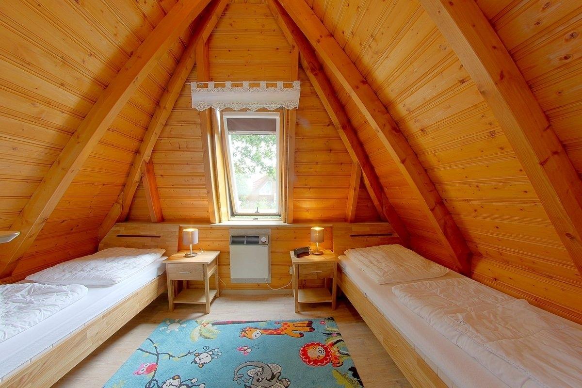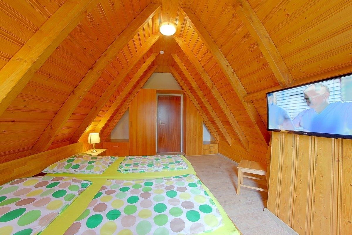 Im Obergeschoss mit Laminatboden befinden sich zwei Schlafzimmer, im Elternschlafzimmer Doppelbett, TV, Nachttische, Uhrenradio sowie zwei Einbauschränke, im Kinderzimmer stehen zwei Einzelbetten, Nachttische und eine Kommode mit Schubladen. En faltbares Kinderbett sind im Einbauschrank oberhalb der Treppe.