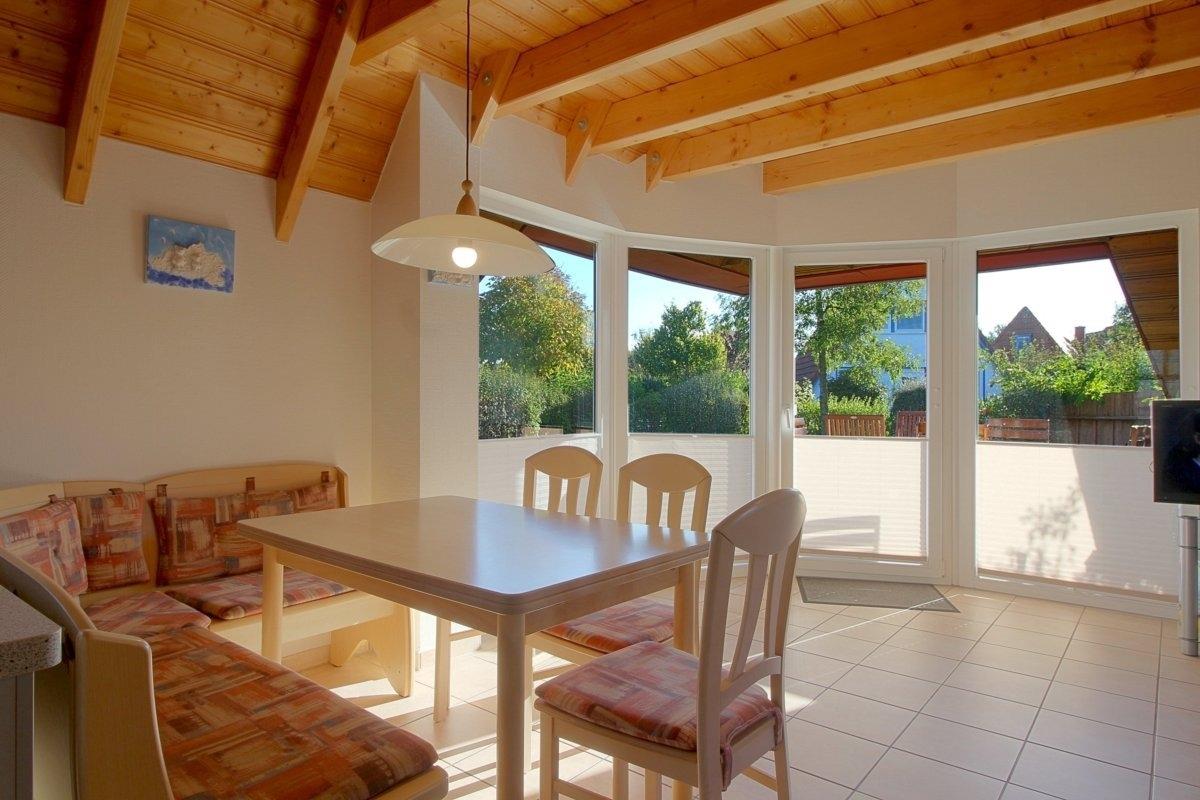 Im Erdgeschoss haben Sie den offenen Wohn- Ess- und Küchenbereich mit Kaminofen für kühle Abende und Ausgang zur Terrasse, sowie Flachbild TV. Die Küche ist komplett ausgestattet mit Pött und Pann und Geschirrspüler.