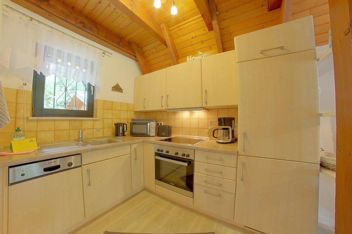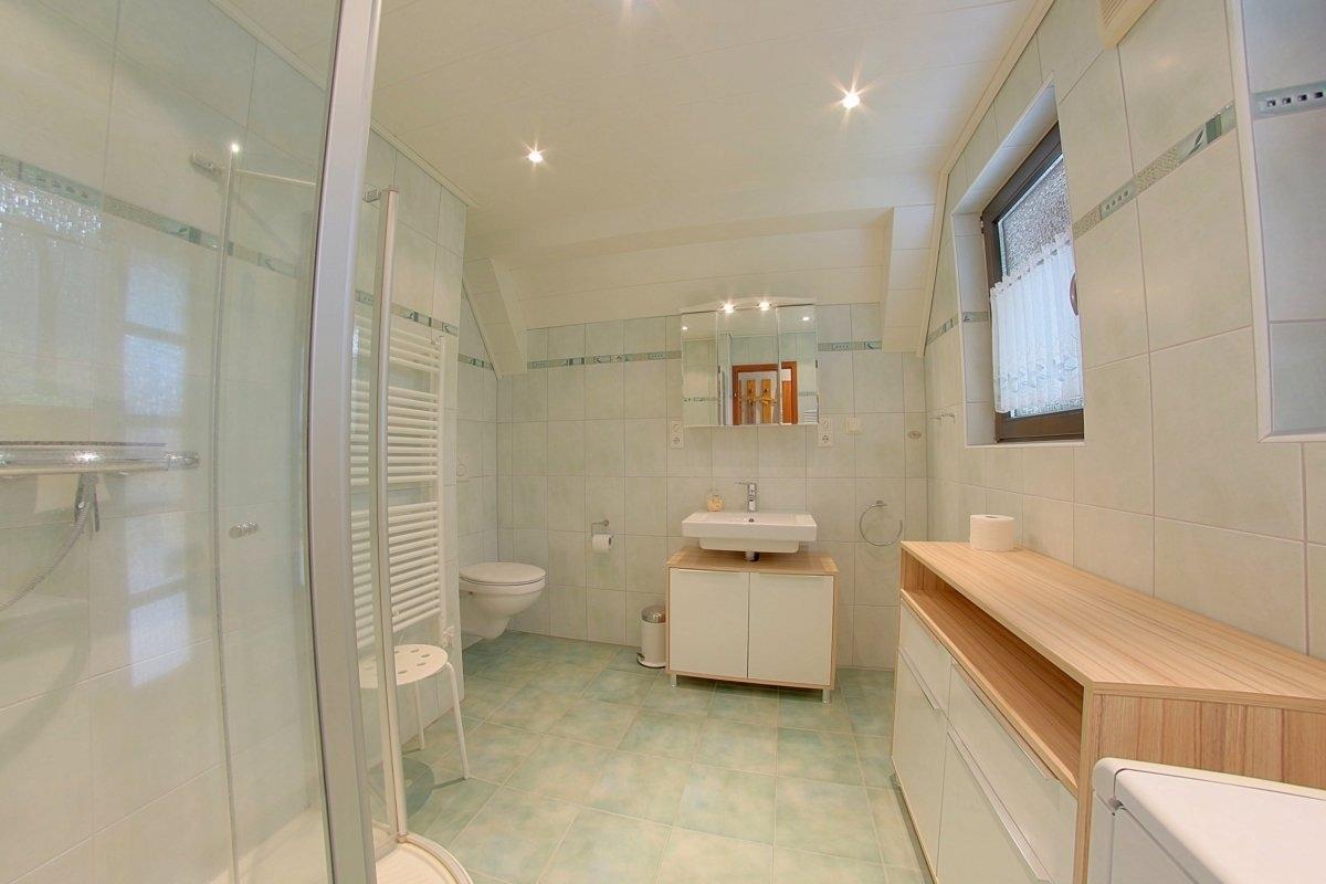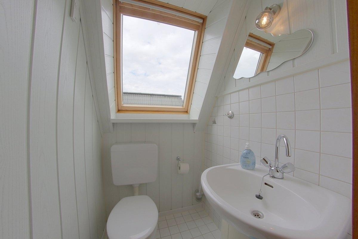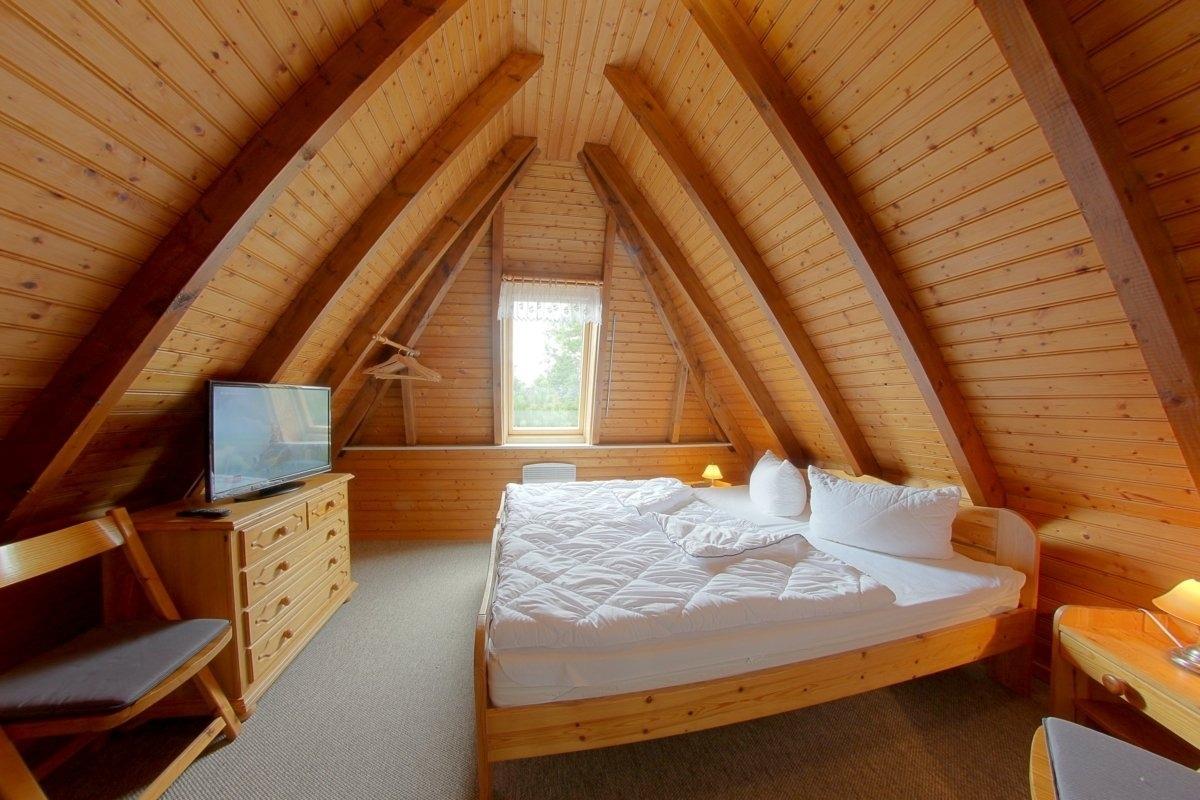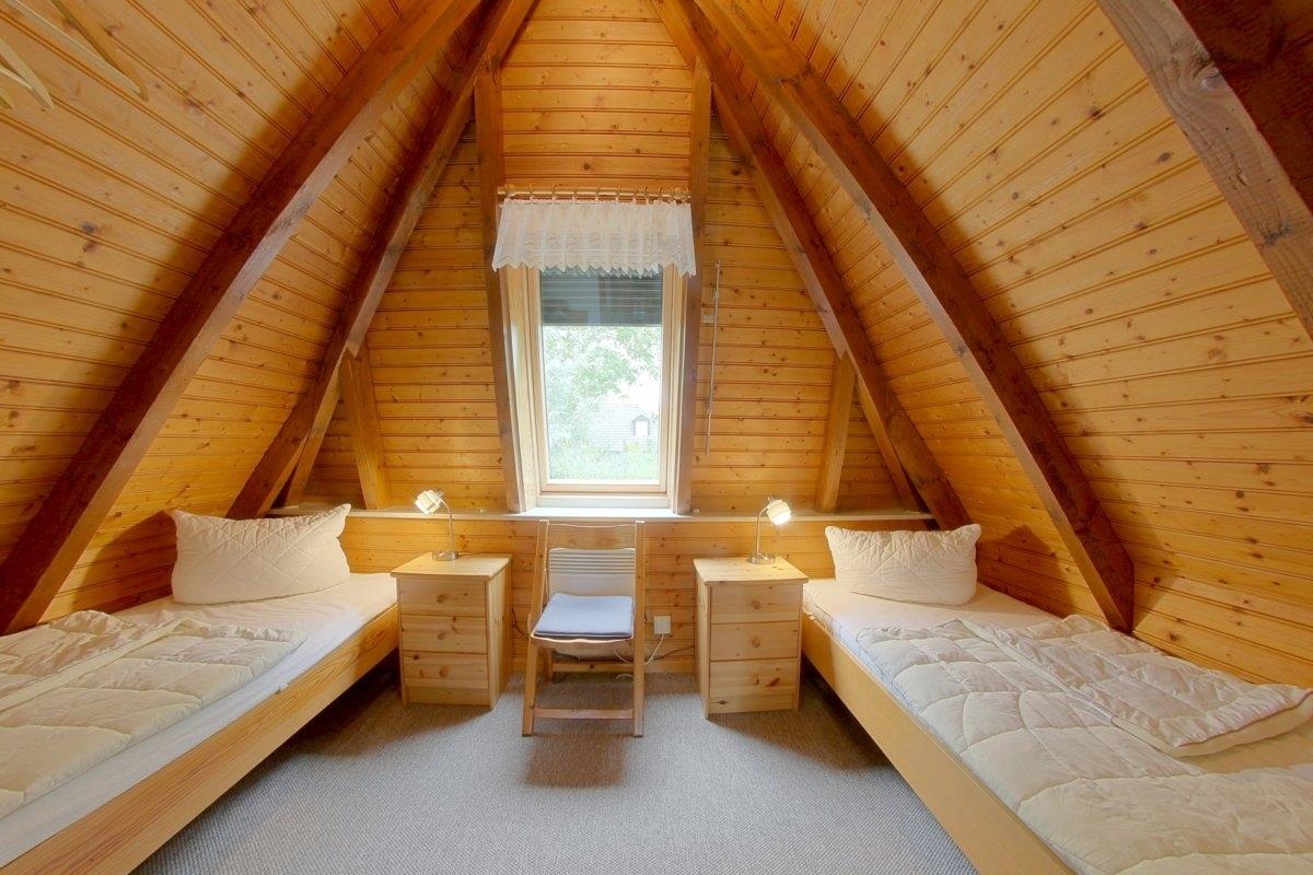 Im Obergeschoß sind die zwei Schlafräume und ein zweites WC mit Handwaschbecken (Kalt- und Warmwasser). Im Elternschlafzimmer ist ein Doppelbett, ein zusätzliches Kinderreisebett und ein zweiter Fernseher. Das Kinderzimmer (kann auch von Erwachsenen benutzt werden) hat zwei Einzelbetten.