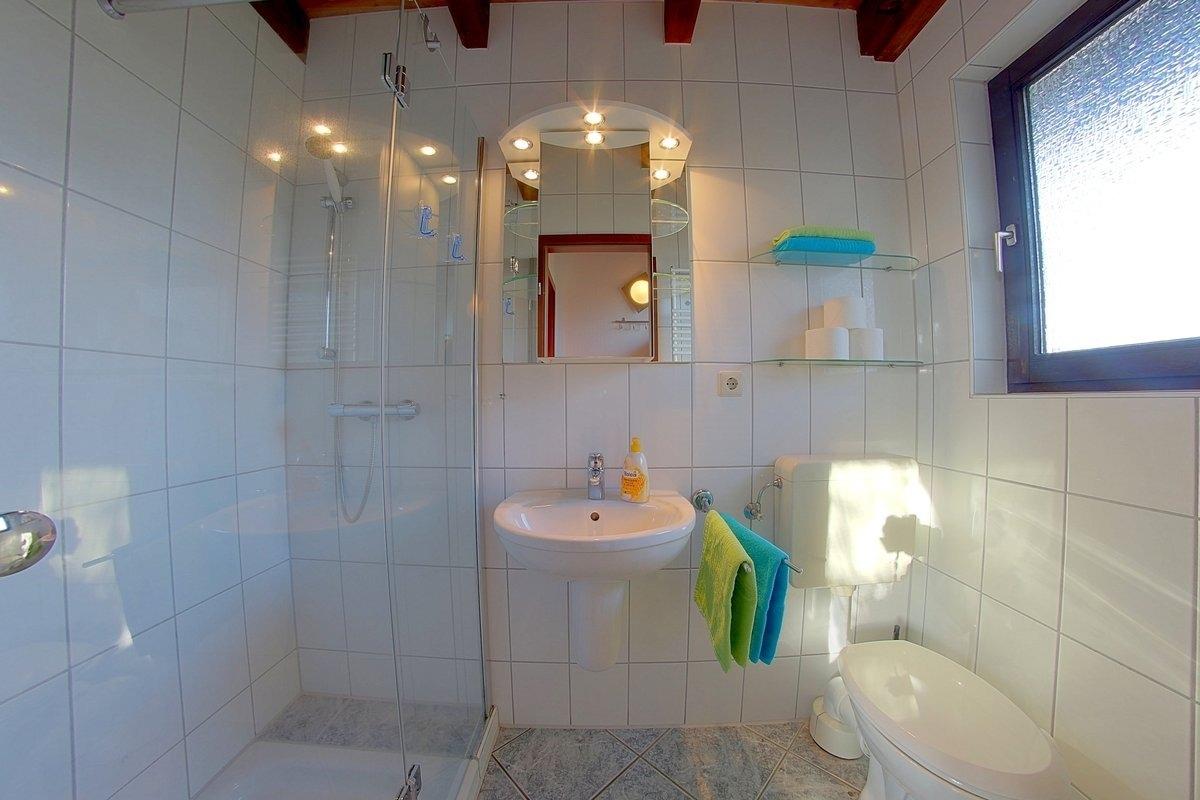 Im Obergeschoss befinden sich die beiden Schlafzimmer sowie Wandschränke für ihr Reisegepäck. Ein Babyreisebett und ein Hochstuhl sind ebenfalls vorhanden.