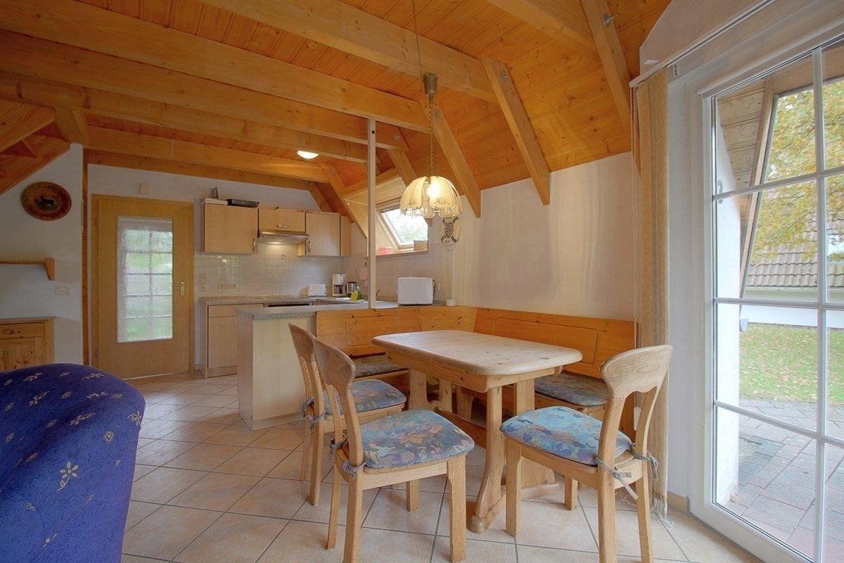 Im gefliesten Wohnbereich gibt es einen offenen Wohnbereich mit Kamin und großem großen Flat-TV, Essplatz und Küche mit komplett ausgestatteter moderner Einbauküche. Von hier aus geht es auf die Terrasse mit Abstellraum und Gartenmöbeln