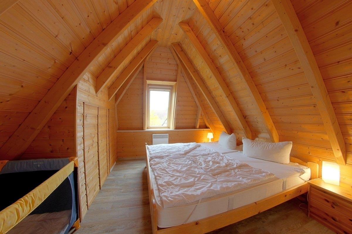 Im Obergeschoss befinden sich zwei weitere Schlafzimmer mit wischbaren Böden und ein WC mit Waschbecken. Ein Schlafzimmer mit Doppelbett und Babyreisebett und ein weiteres Schlafzimmer mit 2 Einzelbetten.