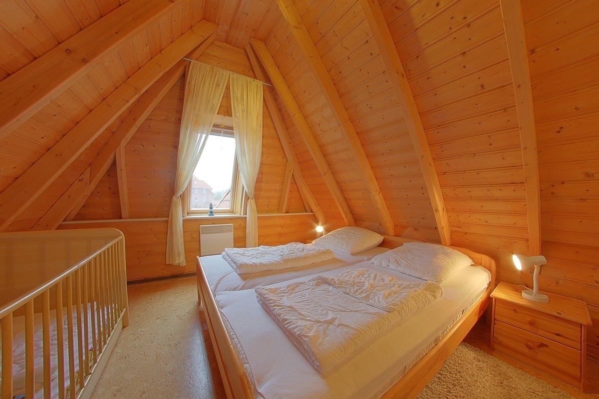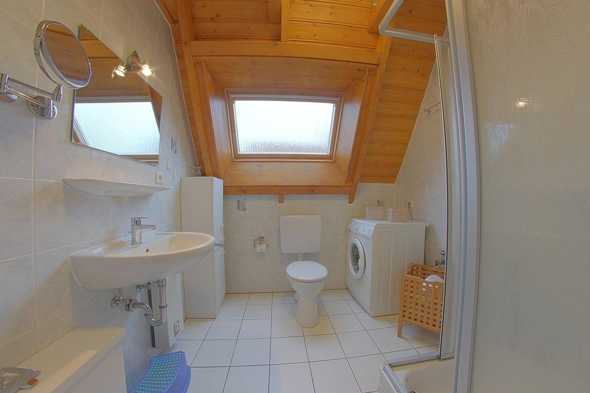 Im Erdgeschoß gibt es ein Schlafzimmer mit Doppelbett und ein helles Duschbad.