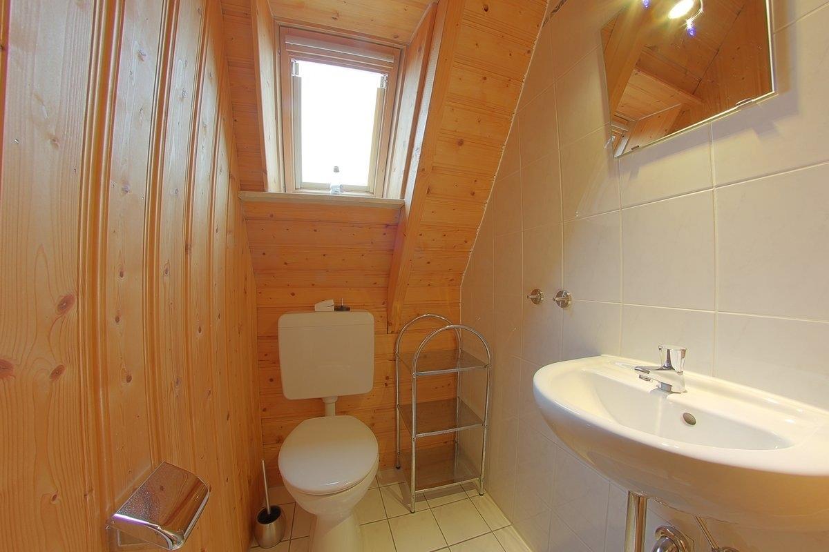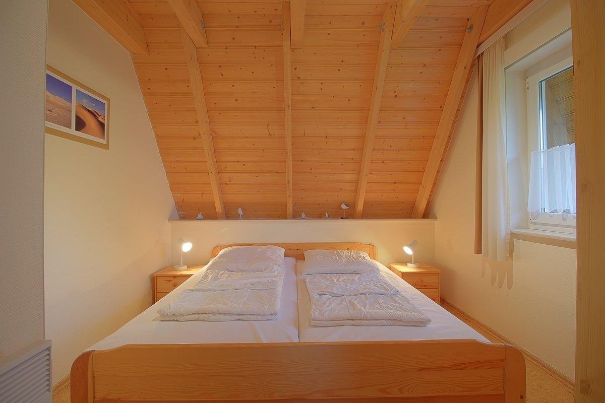 Im Obergeschoss befinden sich zwei weitere Schlafzimmer und ein WC mit Waschbecken. Ein Schlafzimmer mit Doppelbett und Babyreisebett für ein Kleinkind und ein weiteres Schlafzimmer mit 2 Einzelbetten. Beide Zimmer im OG haben je einen kleinen Schreibtisch plus Stuhl