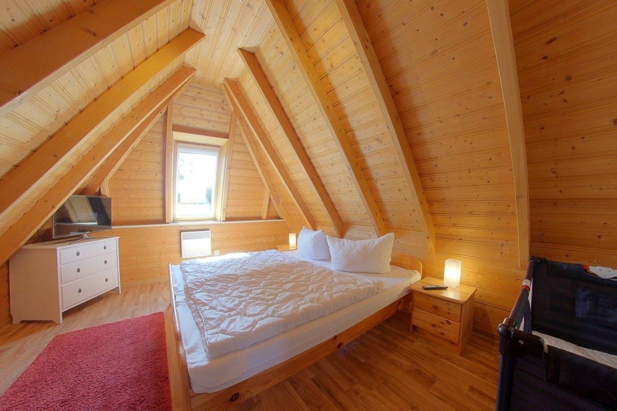 Im Obergeschoss befinden sich zwei Schlafzimmer mit einmal Doppelbett, TV und Babyreisebett und eins mit zwei Einzelbetten. Ebenfalls befindet sich ein WC im Obergeschoss. Das Obergeschoss ist mit hellem eldlen Holz vertäfelt und PVC Boden ausgestattet.