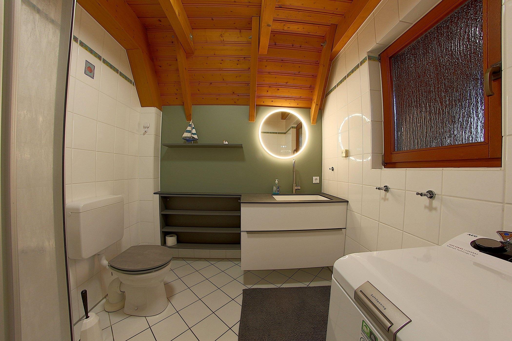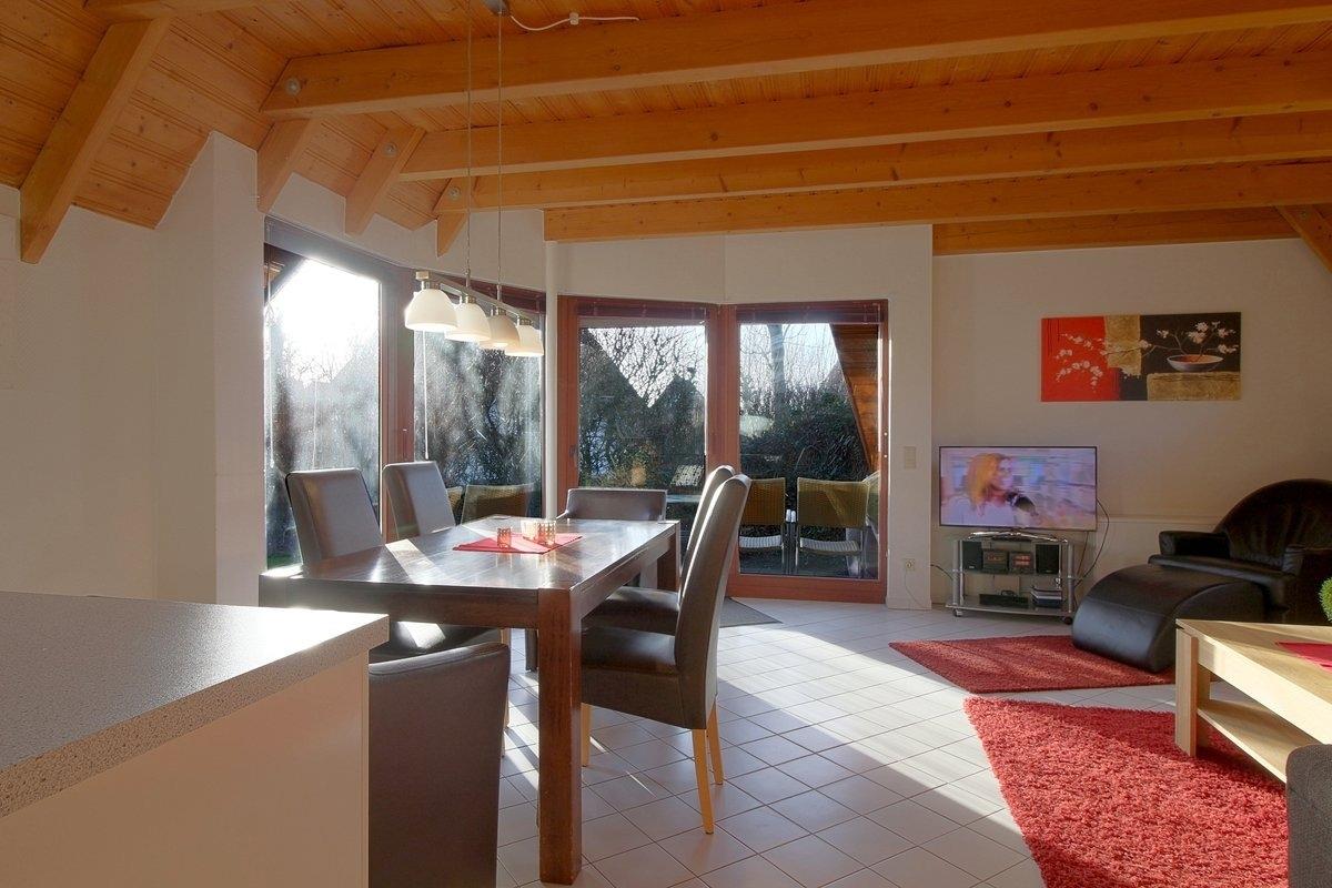 Das Ferienhaus besteht aus einem großzügigen Wohn-/Essbereich mit moderner Einbauküche, Esstisch mit Stühlen und einem schicken modernen Wohnbereich zum Wohlfühlen. Ein modernes Duschbad befindet sich im Erdgeschoss. Das gesamte Erdgeschoss ist mit hellen Fliesen ausgestattet. Kostenloses W-LAN ist vorhanden.