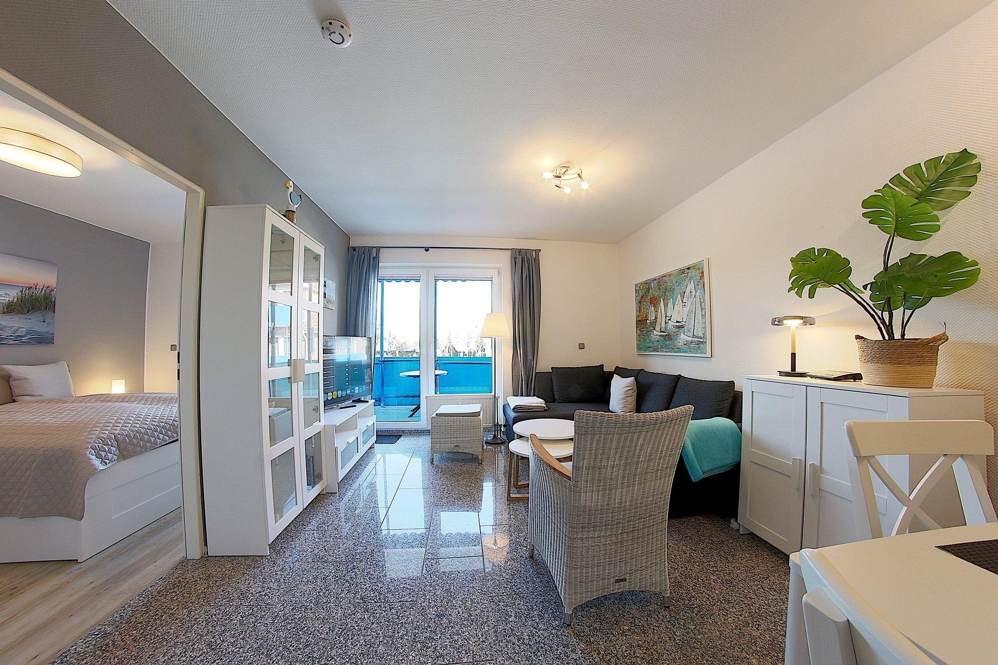 Im frischen, jungen Look präsentiert sich diese Nichtraucher- Ferienwohnung mit einem Schlafraum mit Doppelbett (1,60 x 2,00 m), großer Küchenzeile mit Geschirrspüler und Wohnraum mit Sitzecke und TV. Hochwertige Fußböden mit Granit.