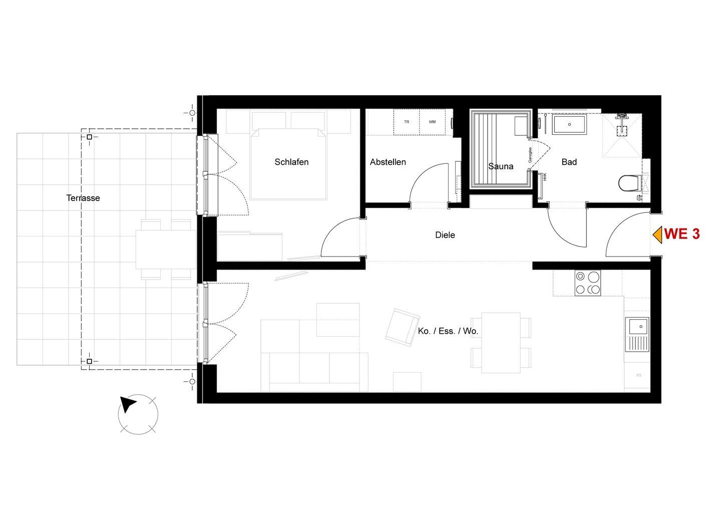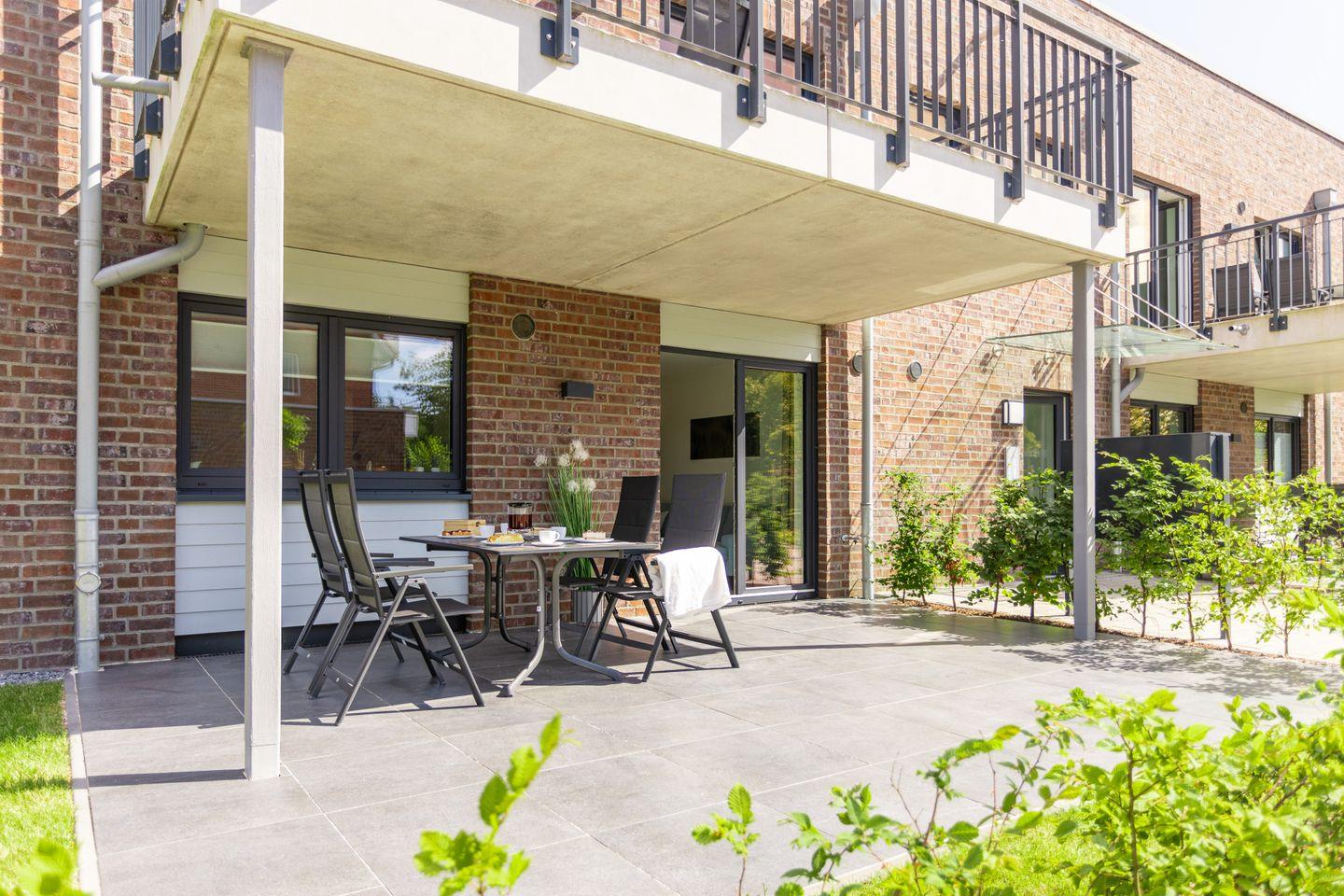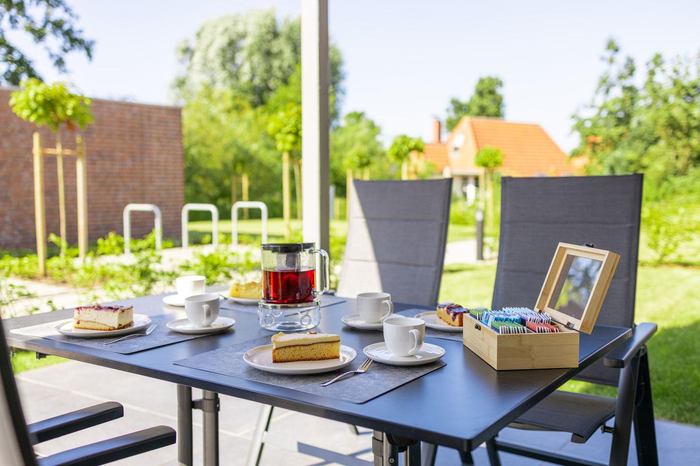Im Wohnbereich erwartet dich eine bequeme Couch, ein Flachbild-TV sowie ein Essplatz mit Blick ins Grüne. Große Fenster und helle Farben schaffen eine freundliche Atmosphäre – perfekt zum Abschalten nach einem Tag am Meer.