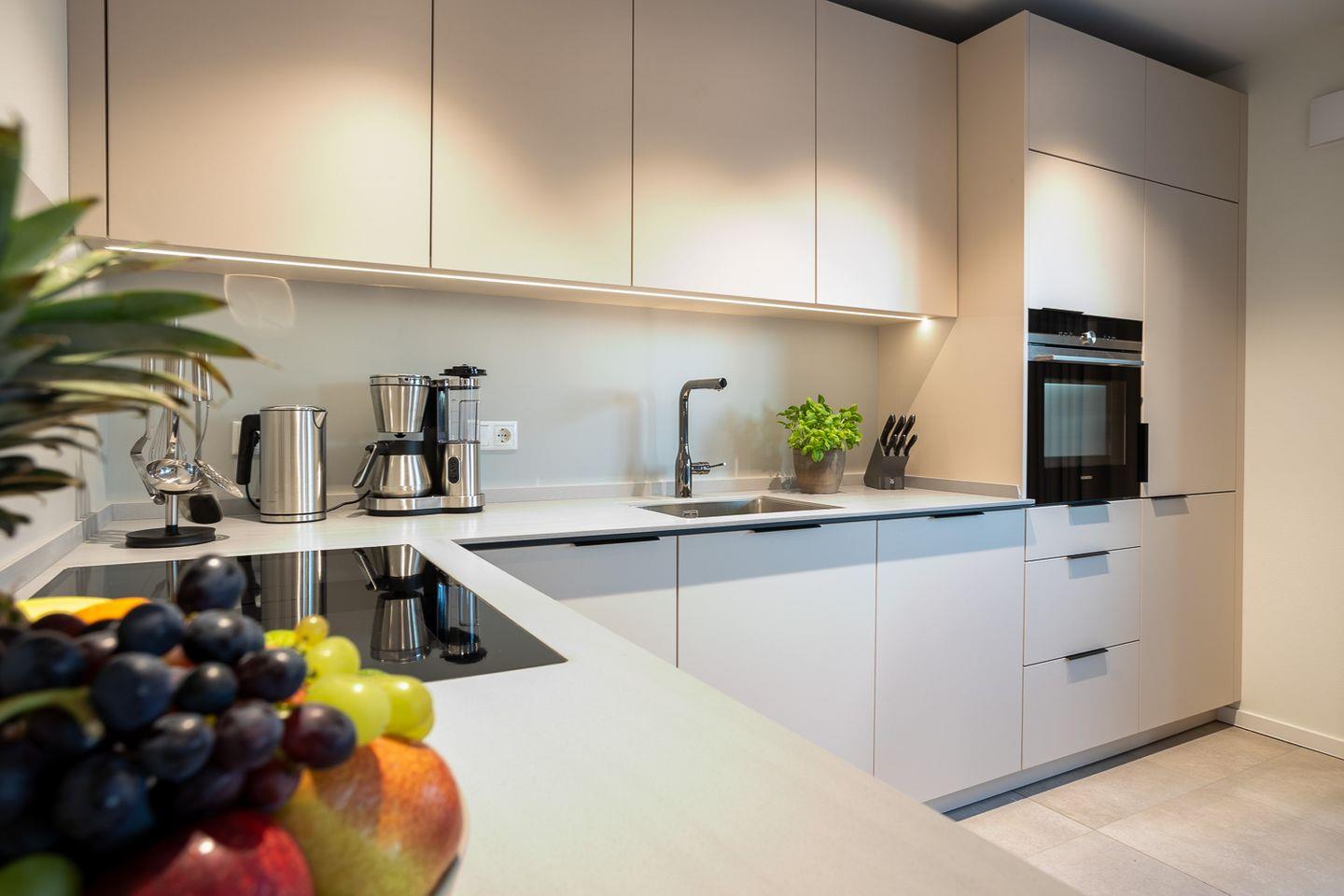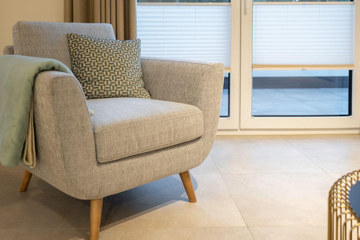 Im offenen Wohnbereich genießt du lichtdurchflutete Räume mit moderner Einrichtung. Ein gemütliches Sofa, Smart-TV, Essbereich und die voll ausgestattete Küche mit Spülmaschine machen es dir leicht, dich wie zuhause zu fühlen. Durch die große Glastür gelangst du direkt auf den Balkon mit herrlichem Blick ins Grüne.