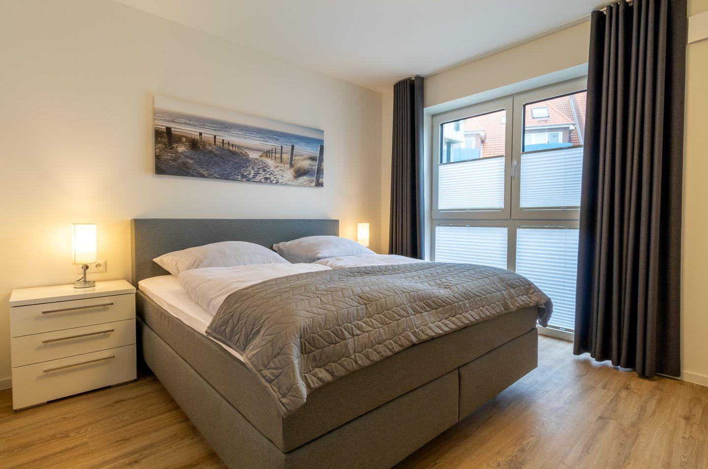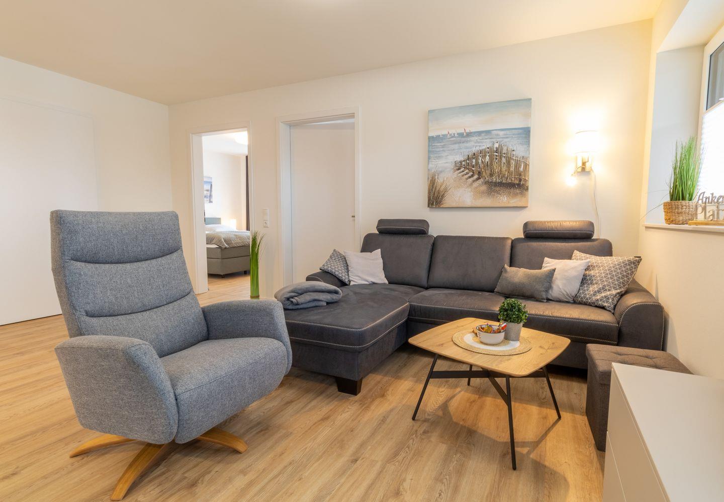 Der offene Wohnbereich lädt mit seinem gemütlichen Sofa, einem Smart-TV und einem Essbereich zum Entspannen ein. Durch die große Fensterfront fällt viel Licht, und die möblierte Terrasse ist direkt zugänglich – hier genießt du die Nordseeluft in vollen Zügen.