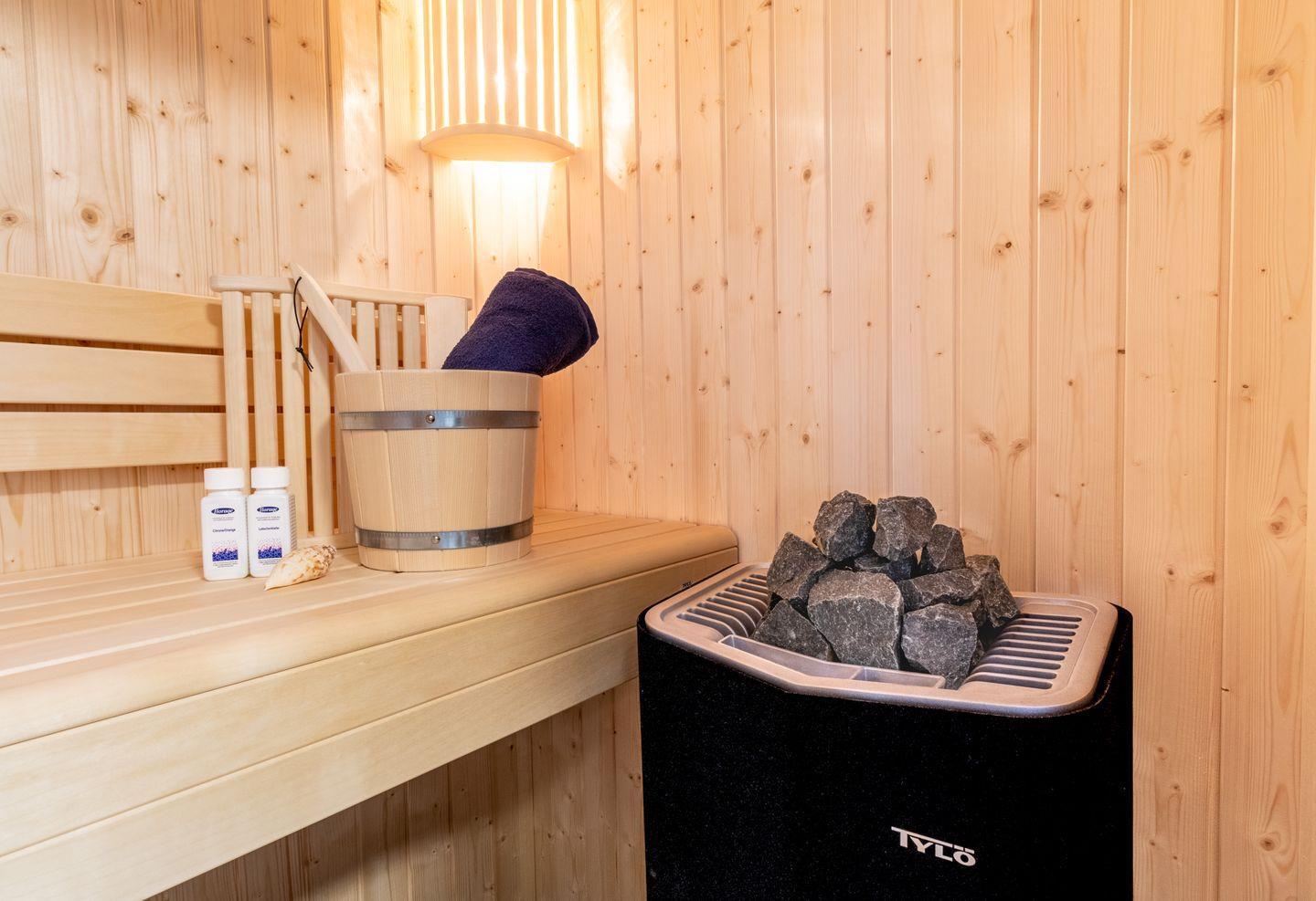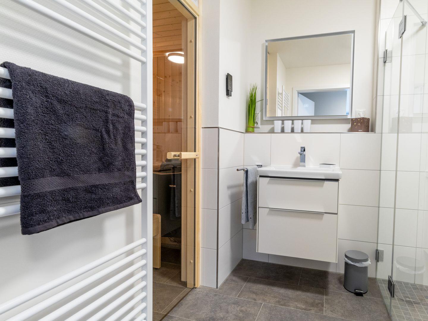 Im modernen Duschbad mit Tageslicht startest du erfrischt in den Tag. Eine ebenerdige Dusche, Sauna, Handtuchheizung und viel Platz bieten den Komfort, den du im Urlaub brauchst.