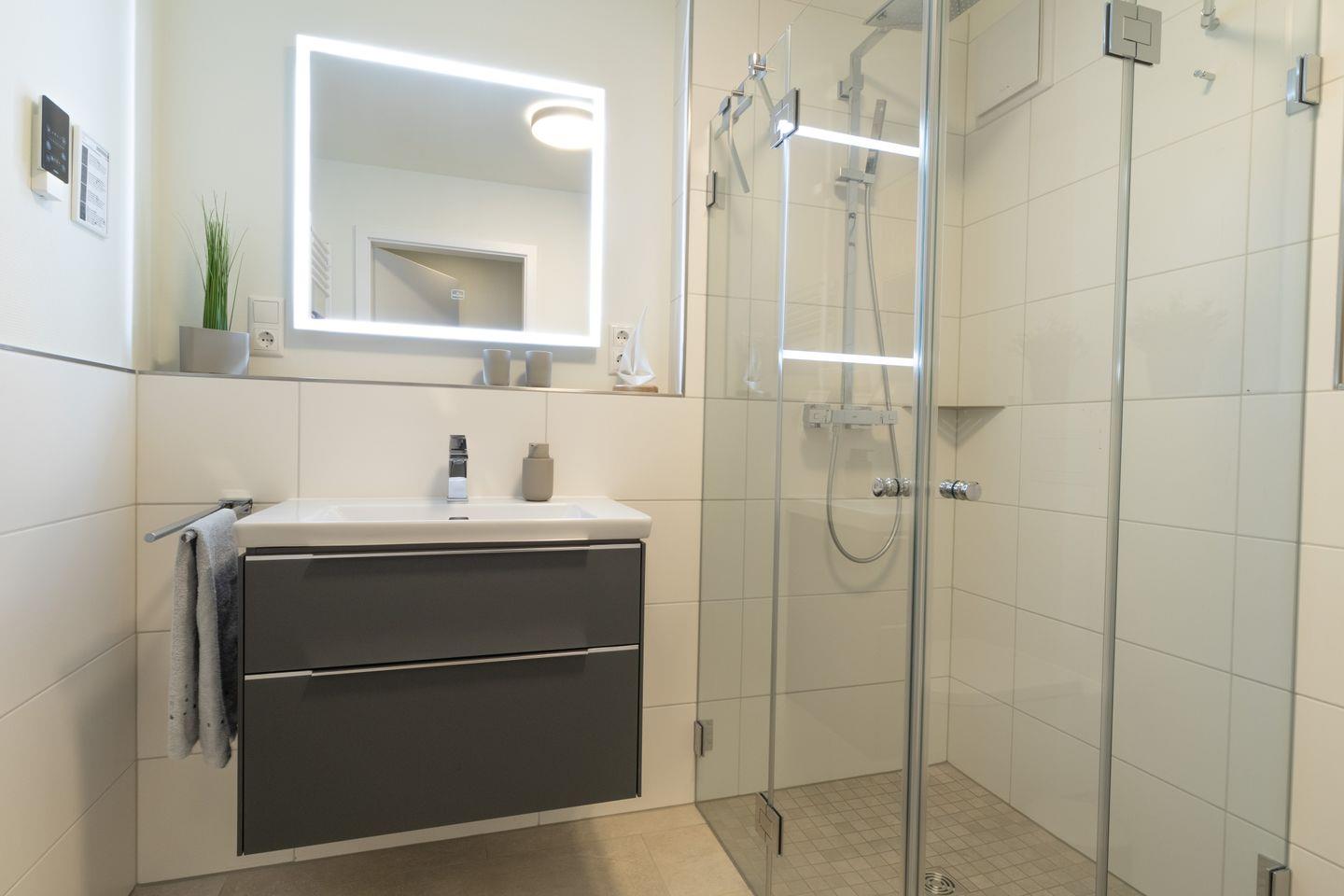 Das helle Bad bietet eine komfortable Dusche, Waschtisch, Spiegel, Handtuchwärmer und viel Platz für deine Pflegeprodukte. Ein Haartrockner ist ebenfalls vorhanden.