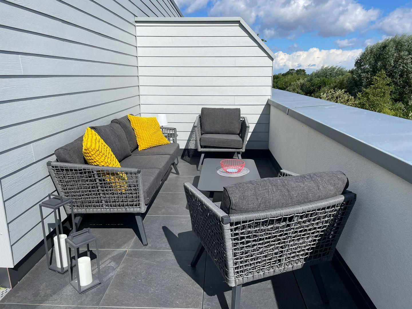 Der lichtdurchflutete Wohn- und Essbereich empfängt dich mit viel Raum und direktem Zugang zur großzügigen Dachterrasse. Hier genießt du den weiten Blick und entspannte Stunden an der frischen Nordseeluft. Bequeme Sitzmöbel und der große Esstisch schaffen den passenden Rahmen für gemeinsame Abende. Die offene Küche ist modern ausgestattet und bietet dir alles, was du für deine Mahlzeiten brauchst.