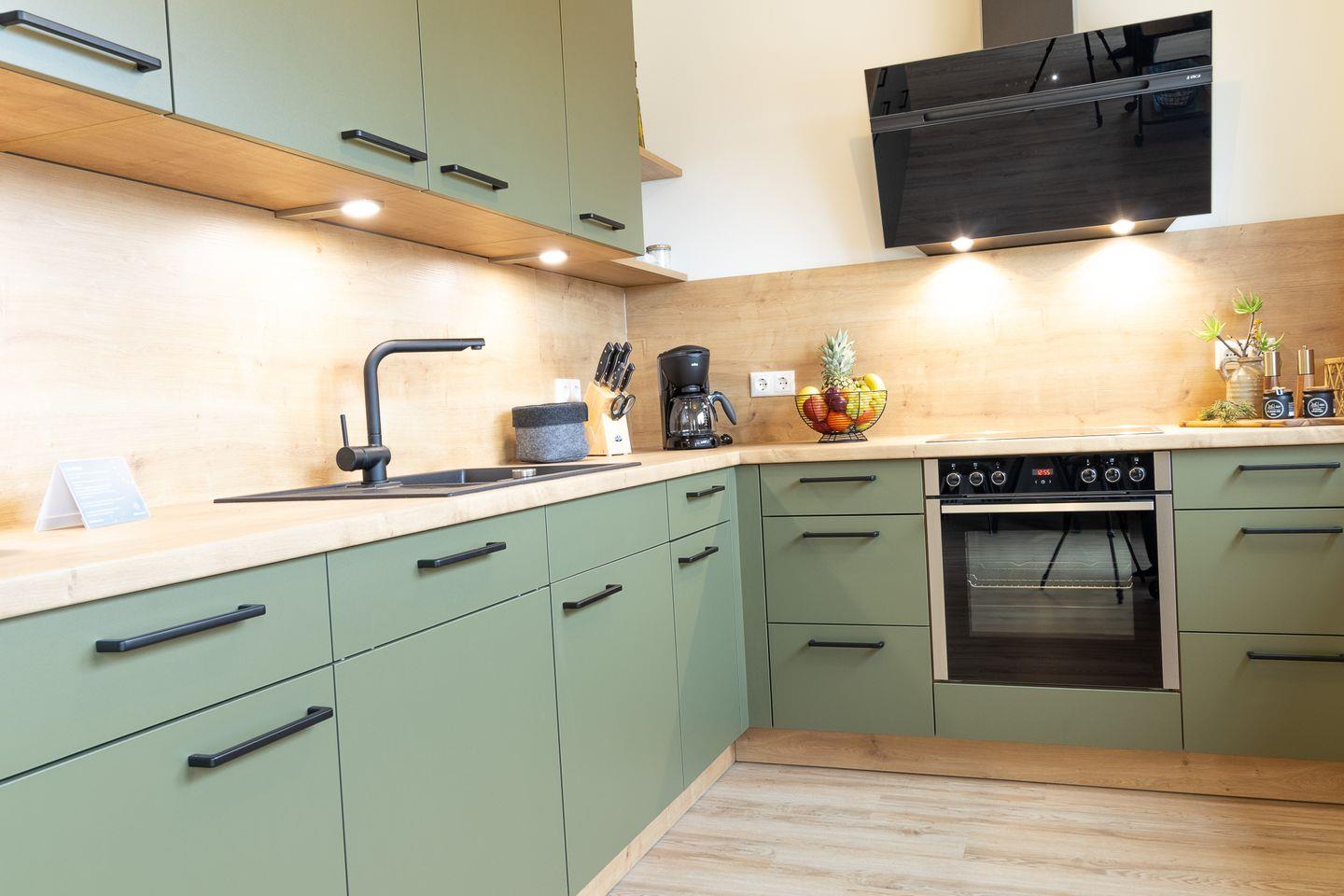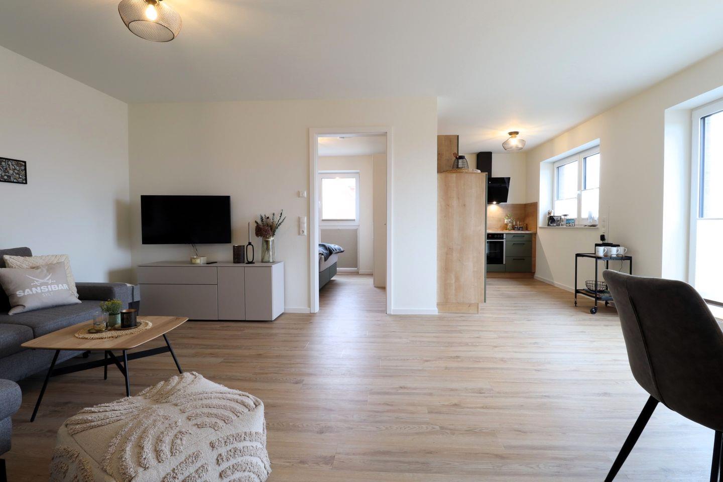 Der lichtdurchflutete Wohnbereich lädt mit einer bequemen Couch, Flachbild-TV und Essplatz zum Verweilen ein. Von hier aus gelangst du direkt auf den überdachten Balkon – ein schöner Ort für Kaffee oder ein Buch mit Aussicht ins Grüne.