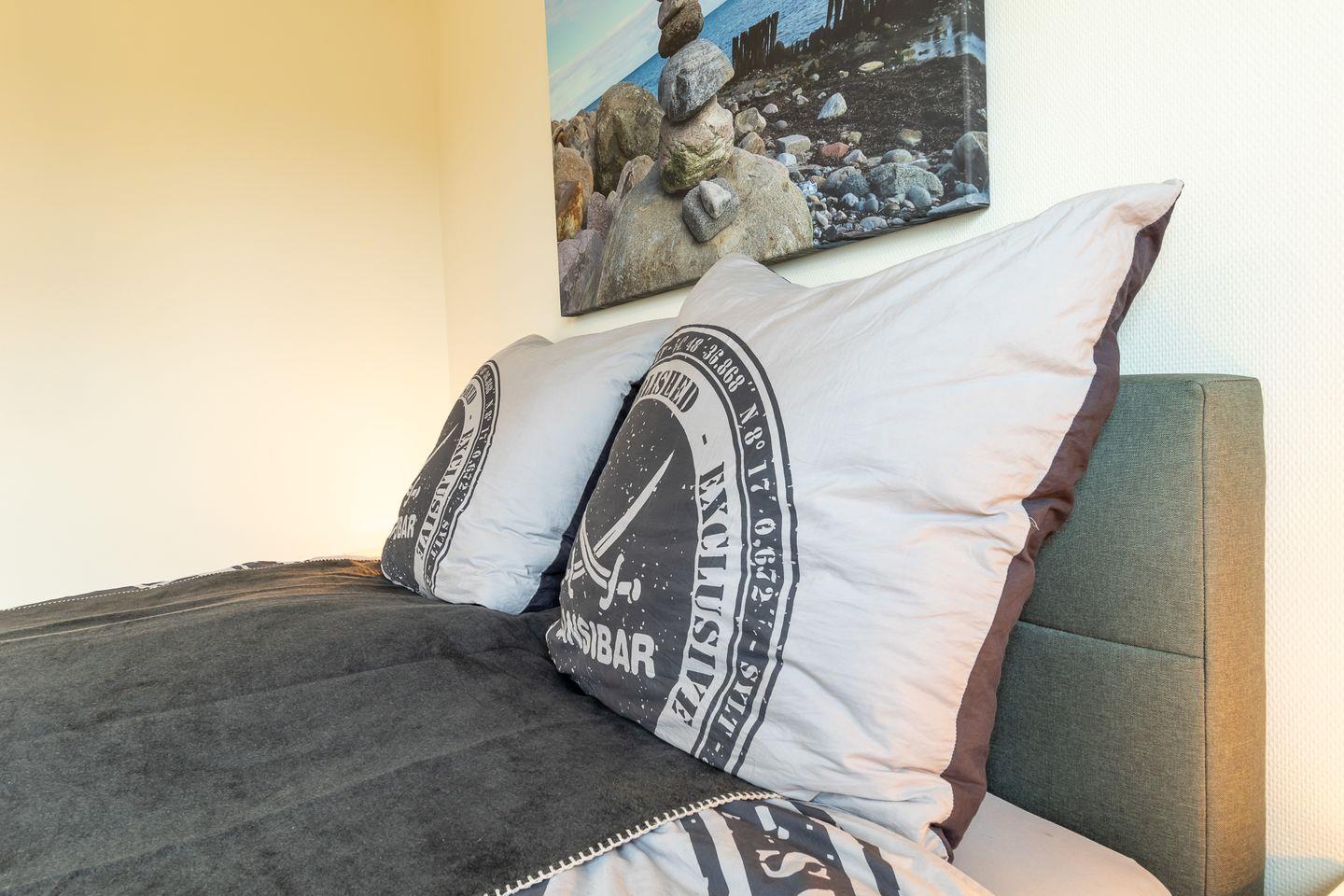 Das separate Schlafzimmer ist mit einem komfortablen Doppelbett ausgestattet und bietet ausreichend Stauraum für dein Gepäck. Auch hier sorgen helle Töne und nordisches Flair für Wohlfühlatmosphäre.