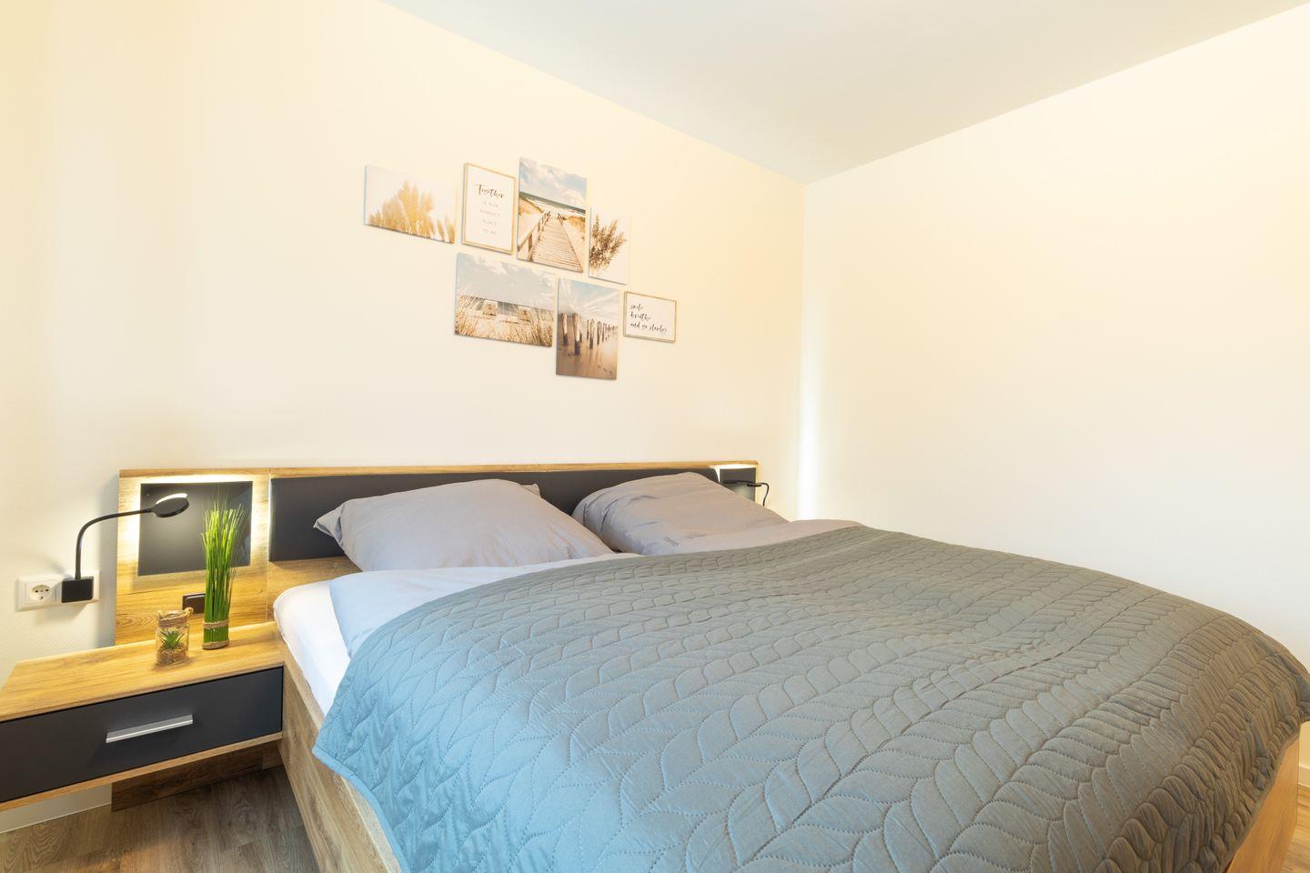 Im separaten Schlafzimmer erwartet dich ein hochwertiges Doppelbett für erholsame Nächte. Verdunkelungsplissees sorgen für einen ruhigen Schlaf. Hier kannst du entspannen und neue Energie tanken.