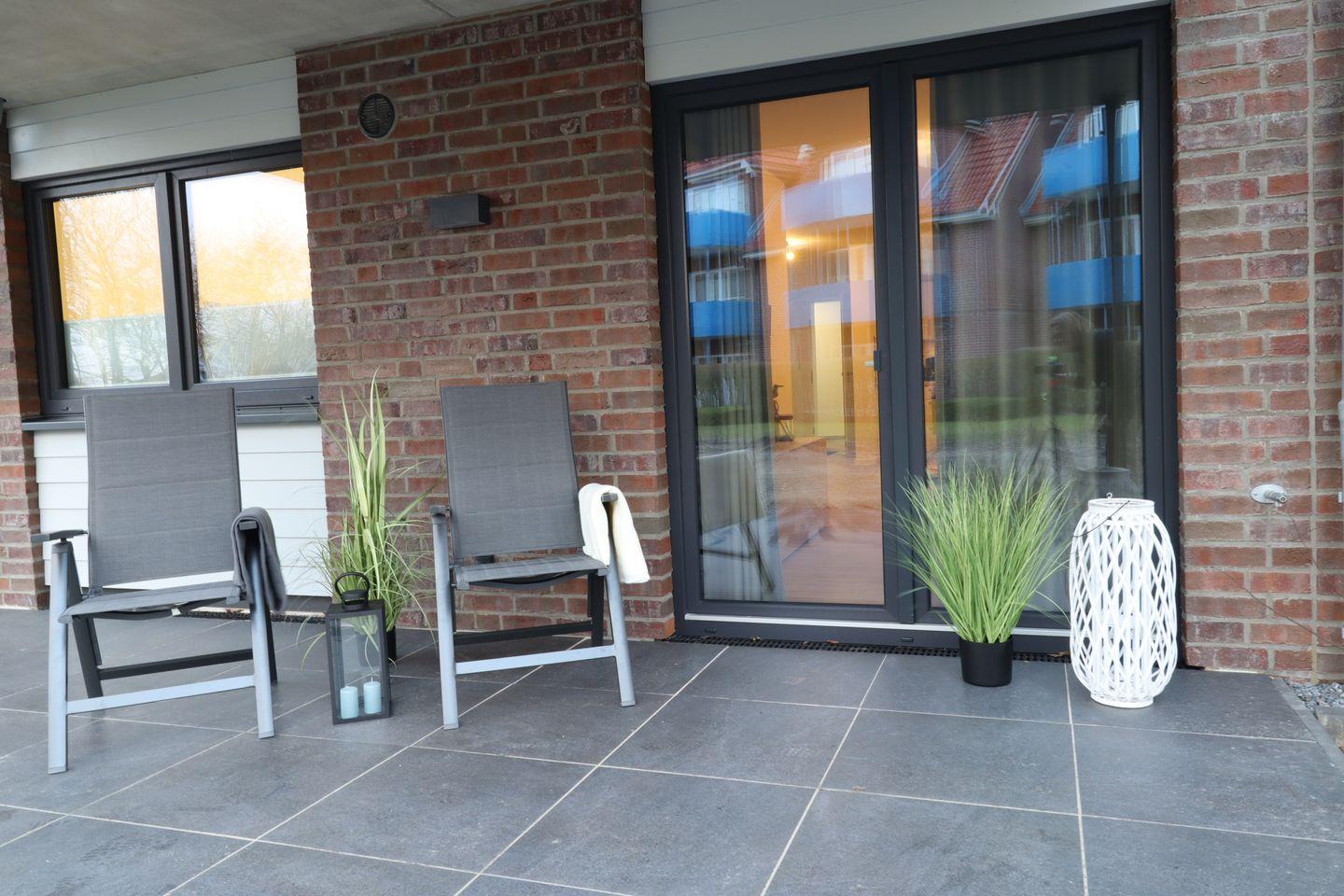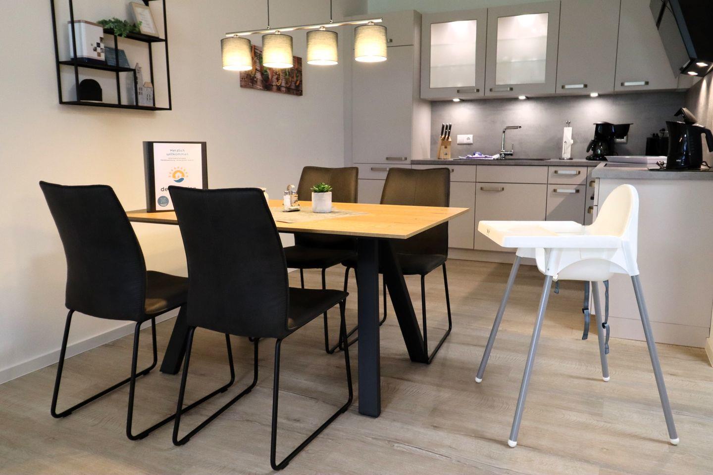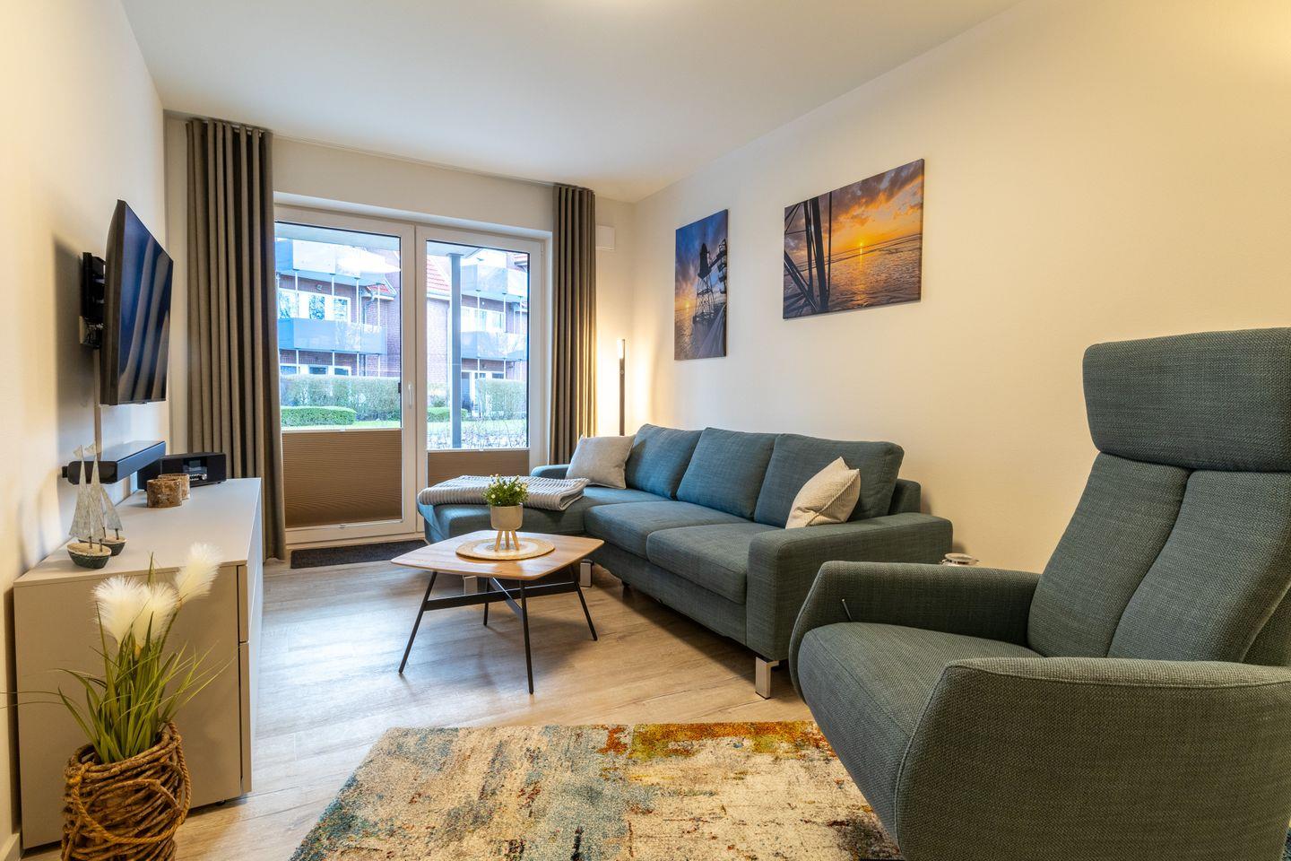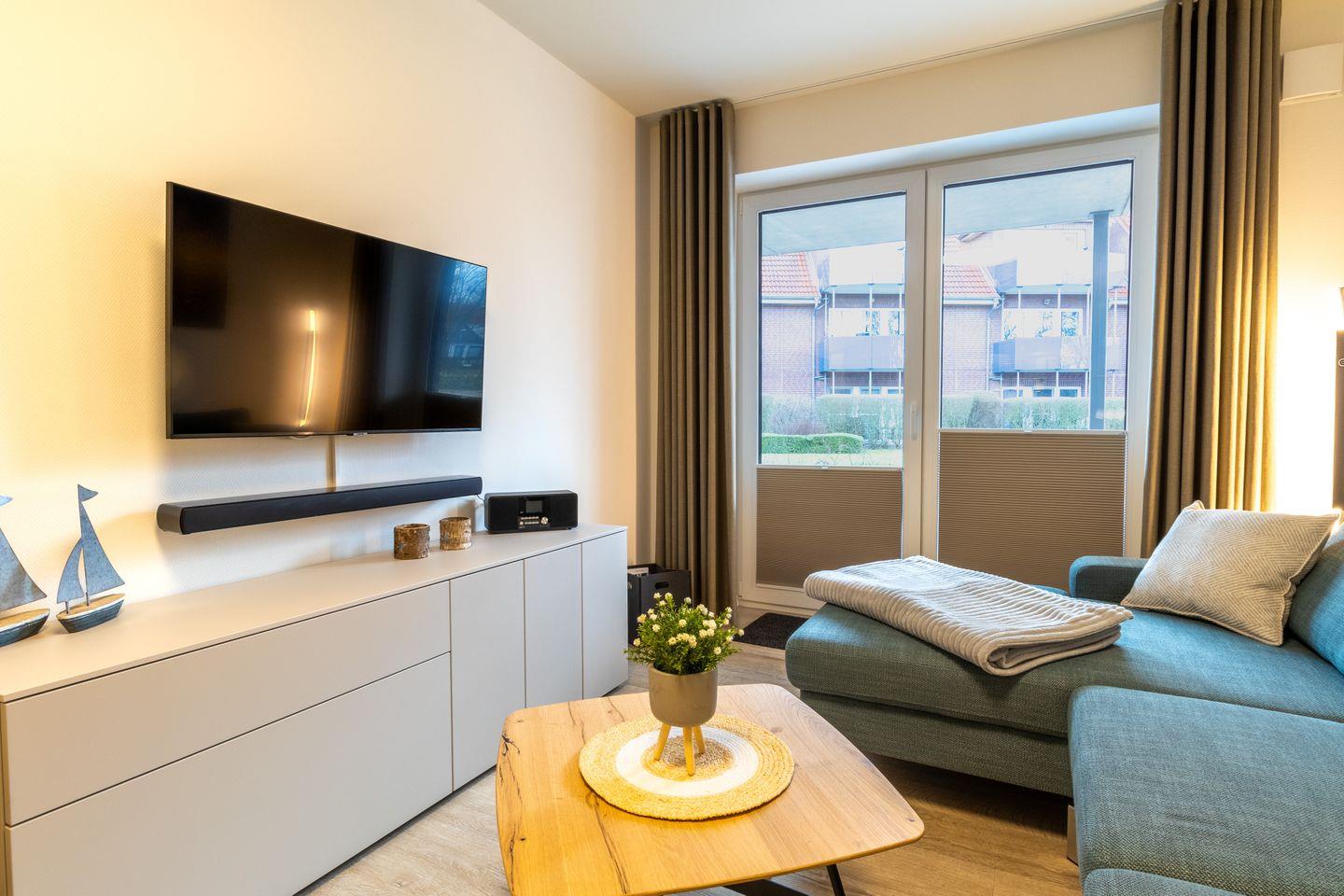 Das helle Wohnzimmer ist modern eingerichtet und lädt mit Sofa, Flachbild-TV und WLAN zum Entspannen ein. Große Fenster sorgen für freundliche Atmosphäre, und von hier gelangst du direkt auf die möblierte Terrasse – ideal für den ersten Kaffee am Morgen oder einen gemütlichen Abend in der Abendsonne. Die offene Küche ist voll ausgestattet, sodass du deine Lieblingsgerichte auch im Urlaub zubereiten kannst.