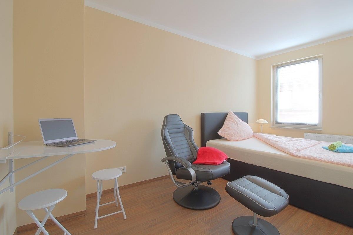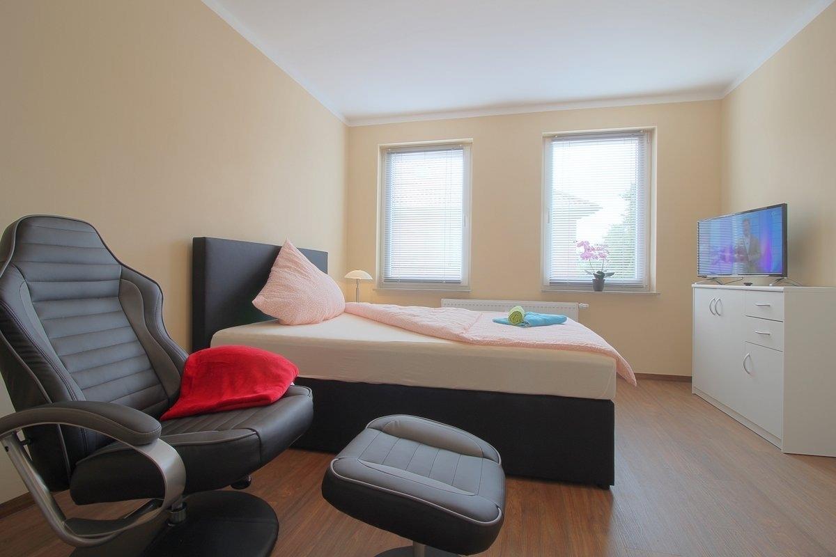 Modern eingerichtetes Einzelzimmer mit einem gemütlichen Boxspringbett, Fernsehsessel, großem Flachbild TV, gemeinsame Küchen- und Badezimmernutzung.