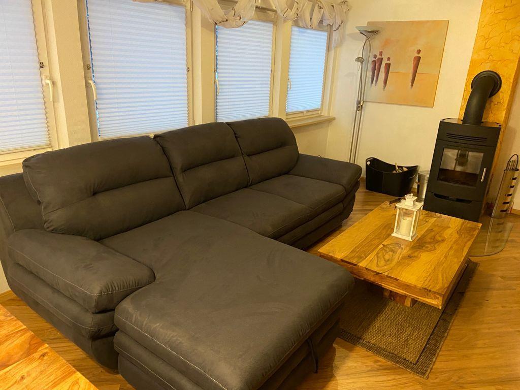- Wohnzimmer mit Kamin, einer gemütlichen Eckledercouch, SAT-TV, DVD und einer Stereoanlage