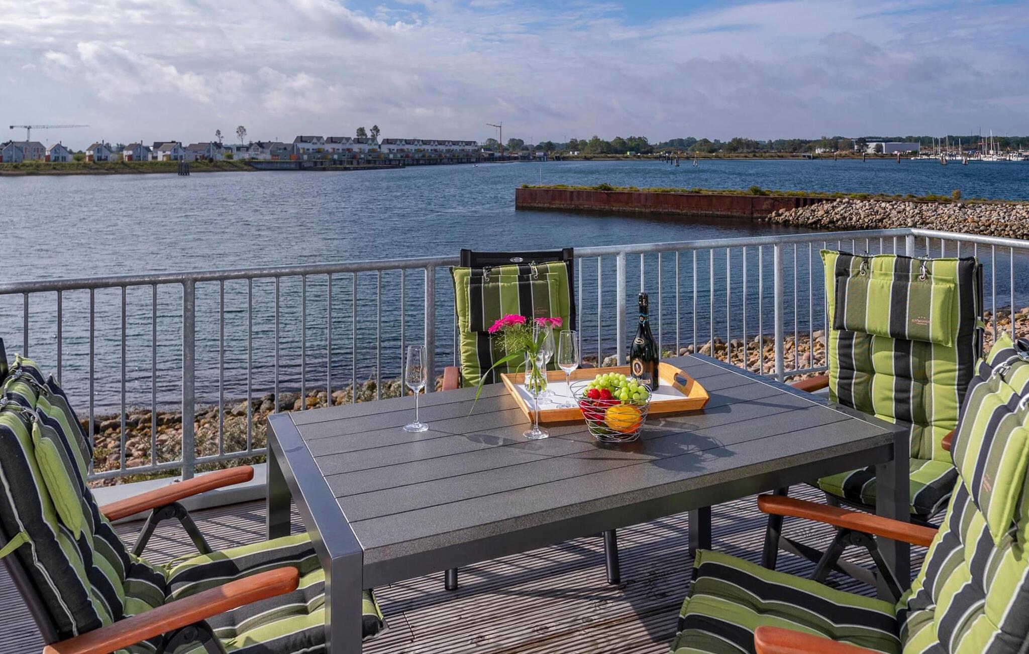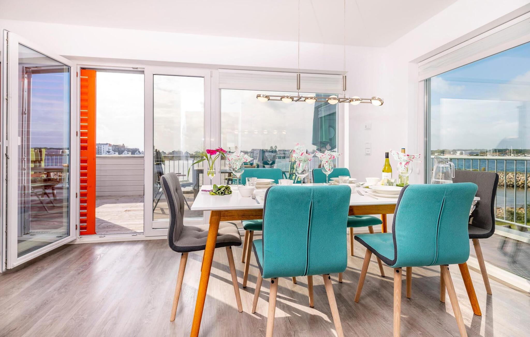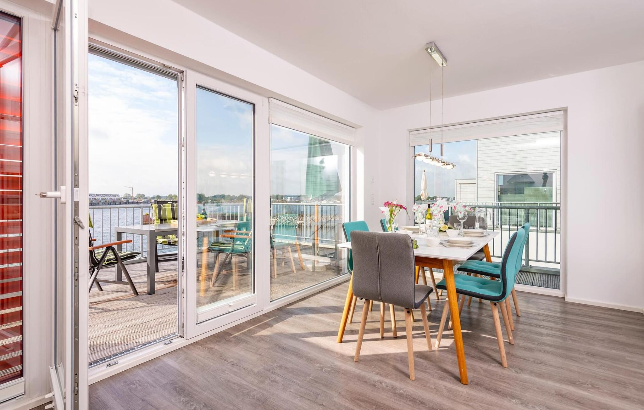Ferielejlighedens stue/spisestue er oversvømmet af lys med gulv til loft panoramavindue, vand så langt øjet rækker. En fantastisk udsigt åbner op på træterrassen direkte ved siden af spisepladsen med udsigt over sejl- og sportsbådshavnen i OstseeResort Olpenitz. Havnebiograf og sol hele dagen er garanteret og sikrer, at I aldrig keder jer.