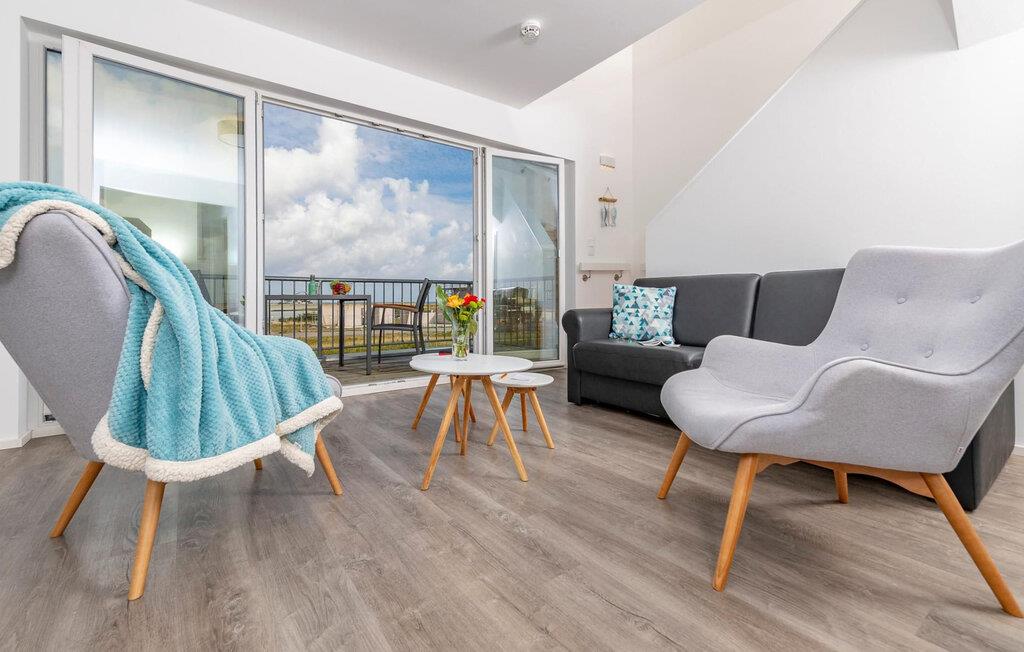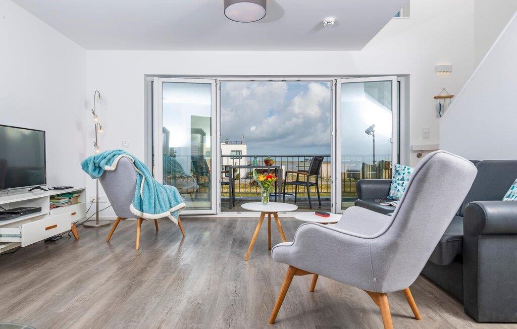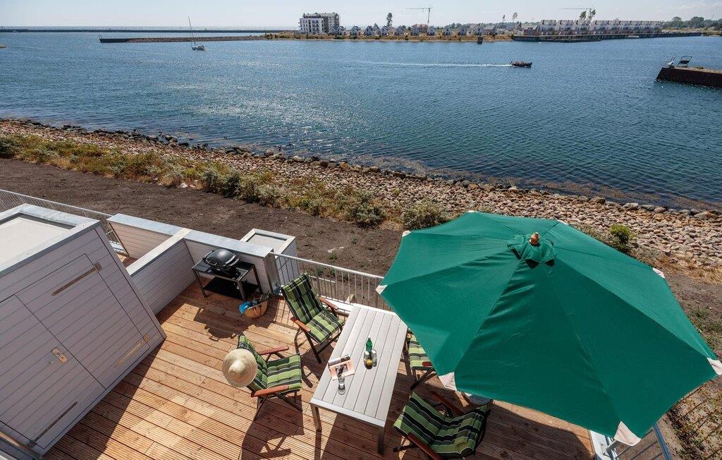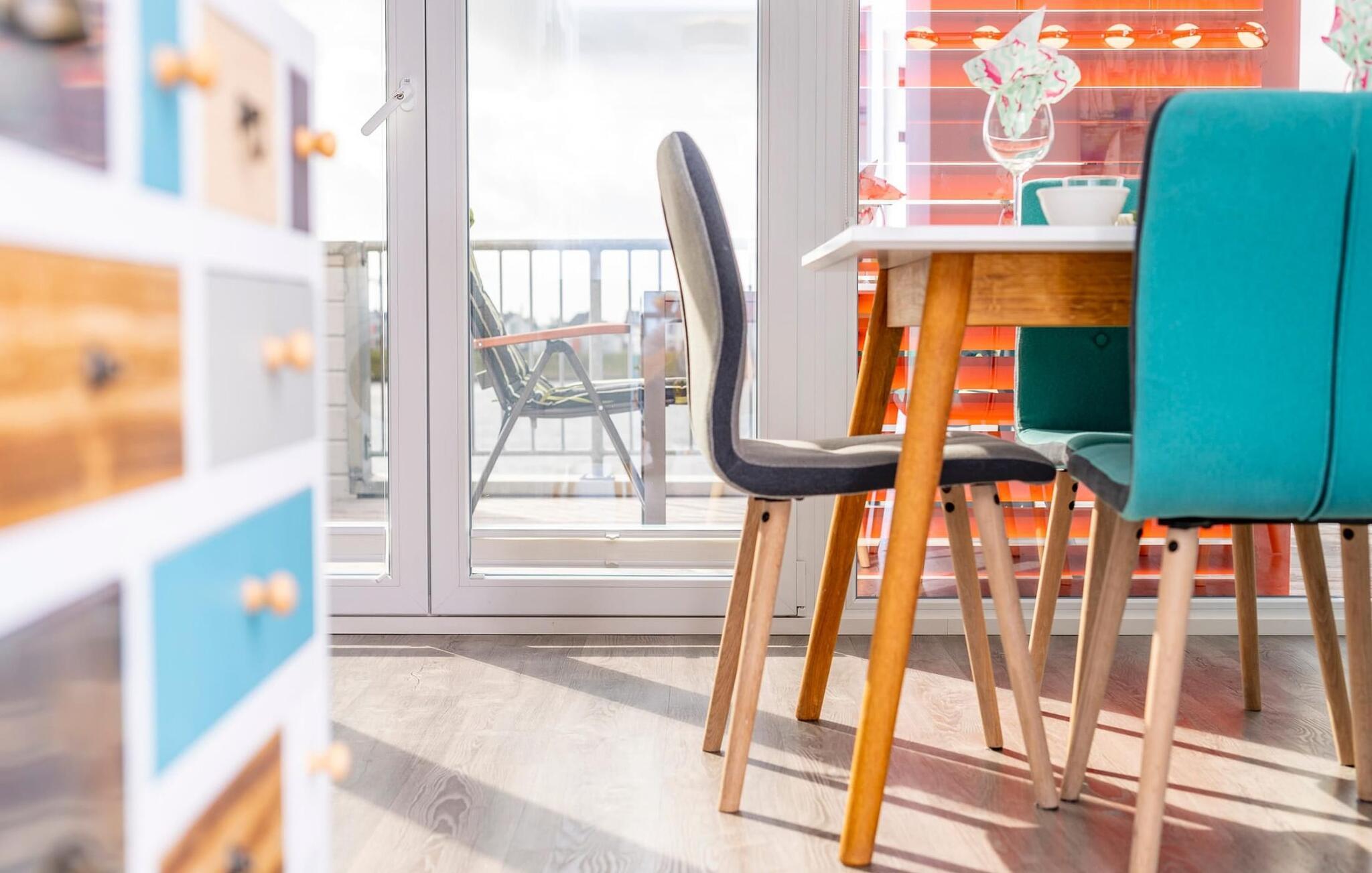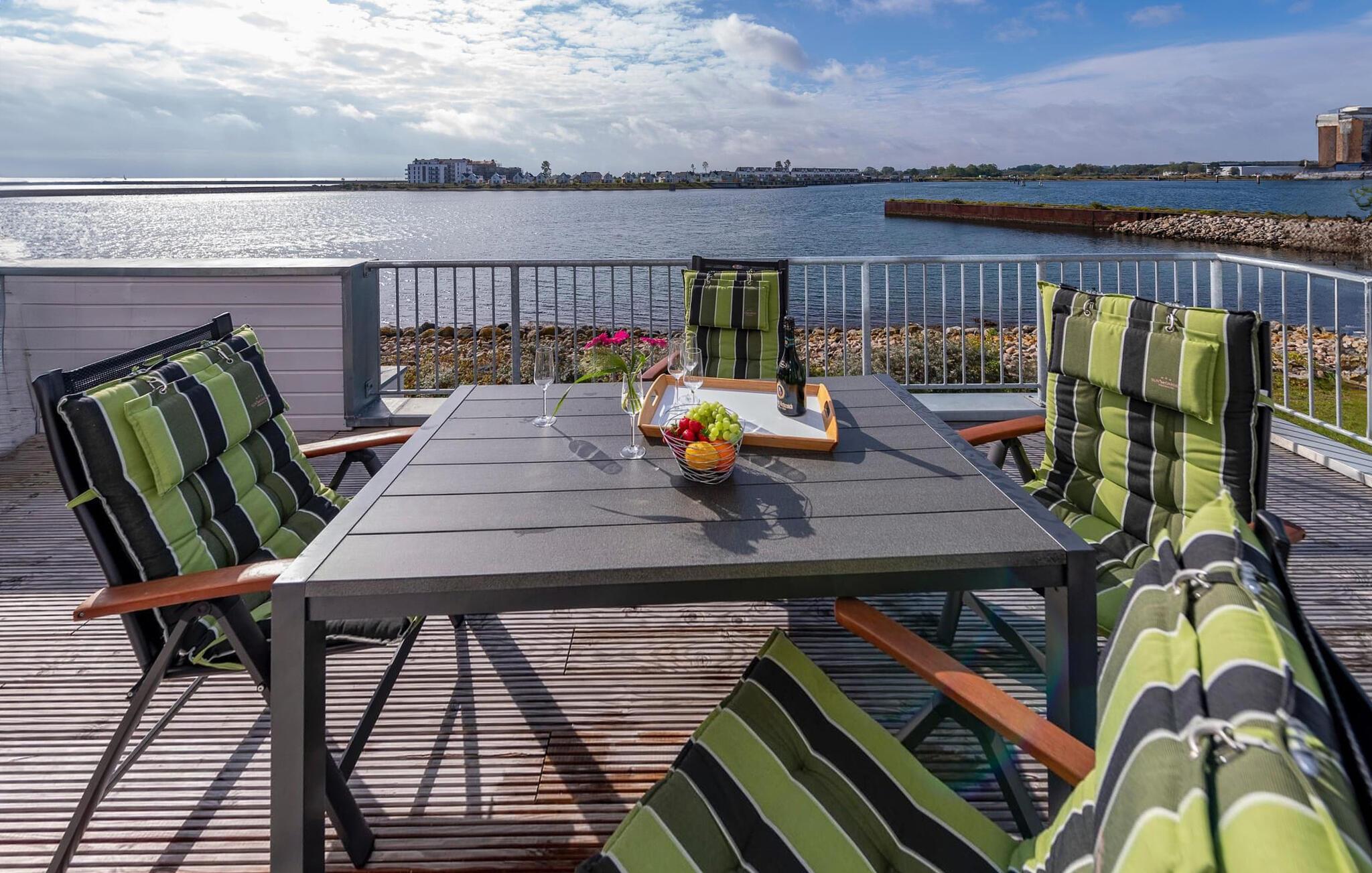 Ferielejlighedens stue/spisestue er oversvømmet af lys med gulv til loft panoramavindue, vand så langt øjet rækker. En fantastisk udsigt åbner op på træterrassen direkte ved siden af spisepladsen med udsigt over sejl- og sportsbådshavnen i OstseeResort Olpenitz. Havnebiograf og sol hele dagen er garanteret og sikrer, at I aldrig keder jer.