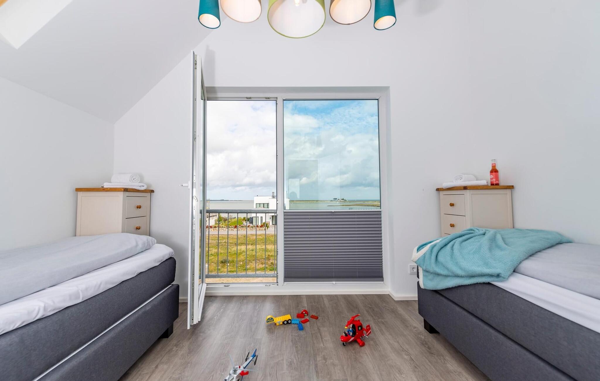 Det store soveværelse har en fantastisk udsigt over sejl- og sportsbådshavnen i OstseeResort Olpenitz og en hyggelig dobbeltseng. Et ekstra fjernsyn sørger for underholdning her. Det andet soveværelse har to enkeltsenge, der kan skubbes sammen og en fascinerende udsigt over Slien. Dette soveværelse er også udstyret med et tv. To ekstra sovepladser er tilgængelige på den komfortable sovesofa i opholdsstuen.