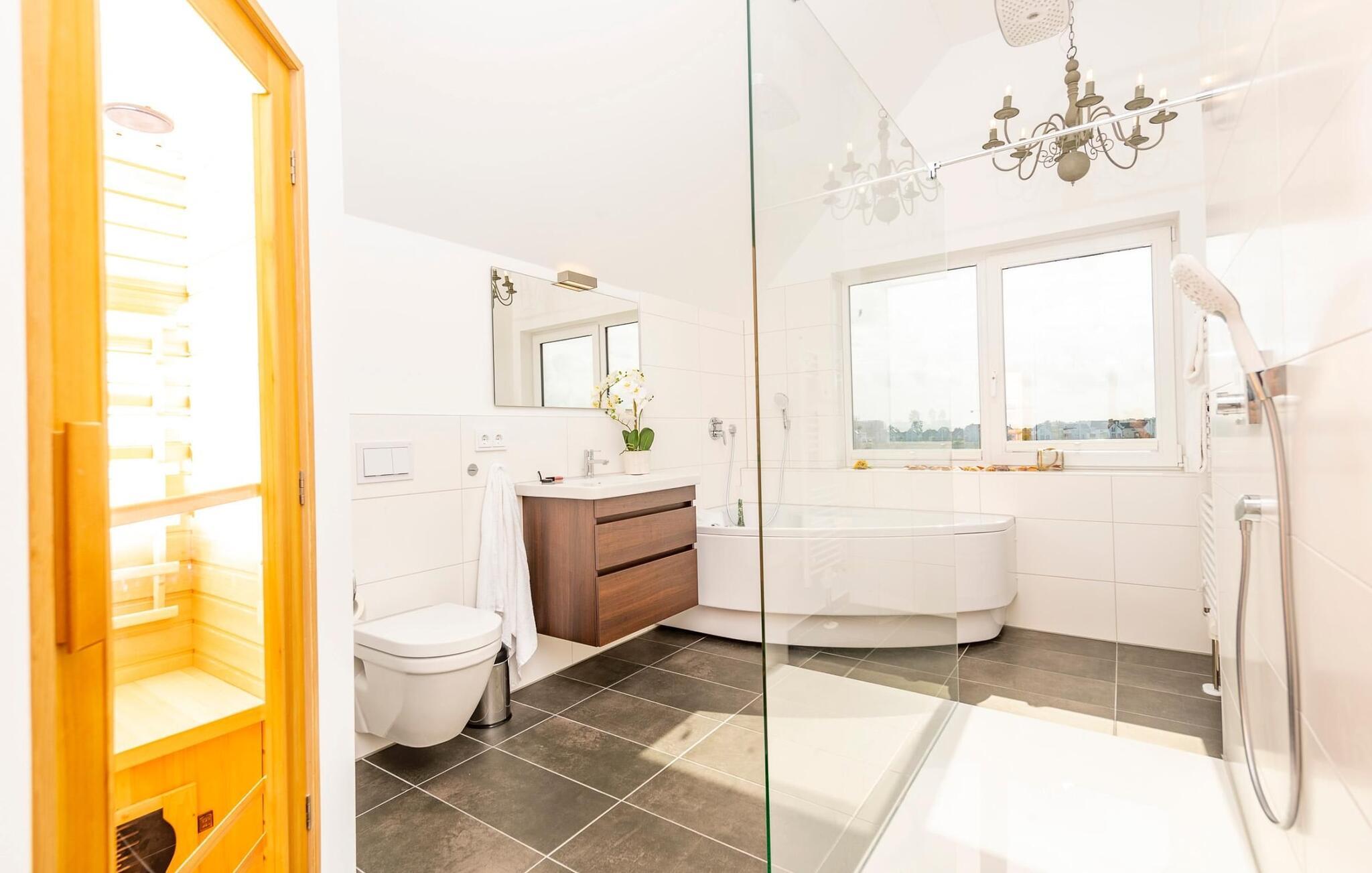 Wellnesselskere vil også få noget for pengene: Den private infrarøde sauna (varmekabine) med LED-farvelysterapi og et boblebad inviterer jer til at slappe af efter en gåtur på stranden.