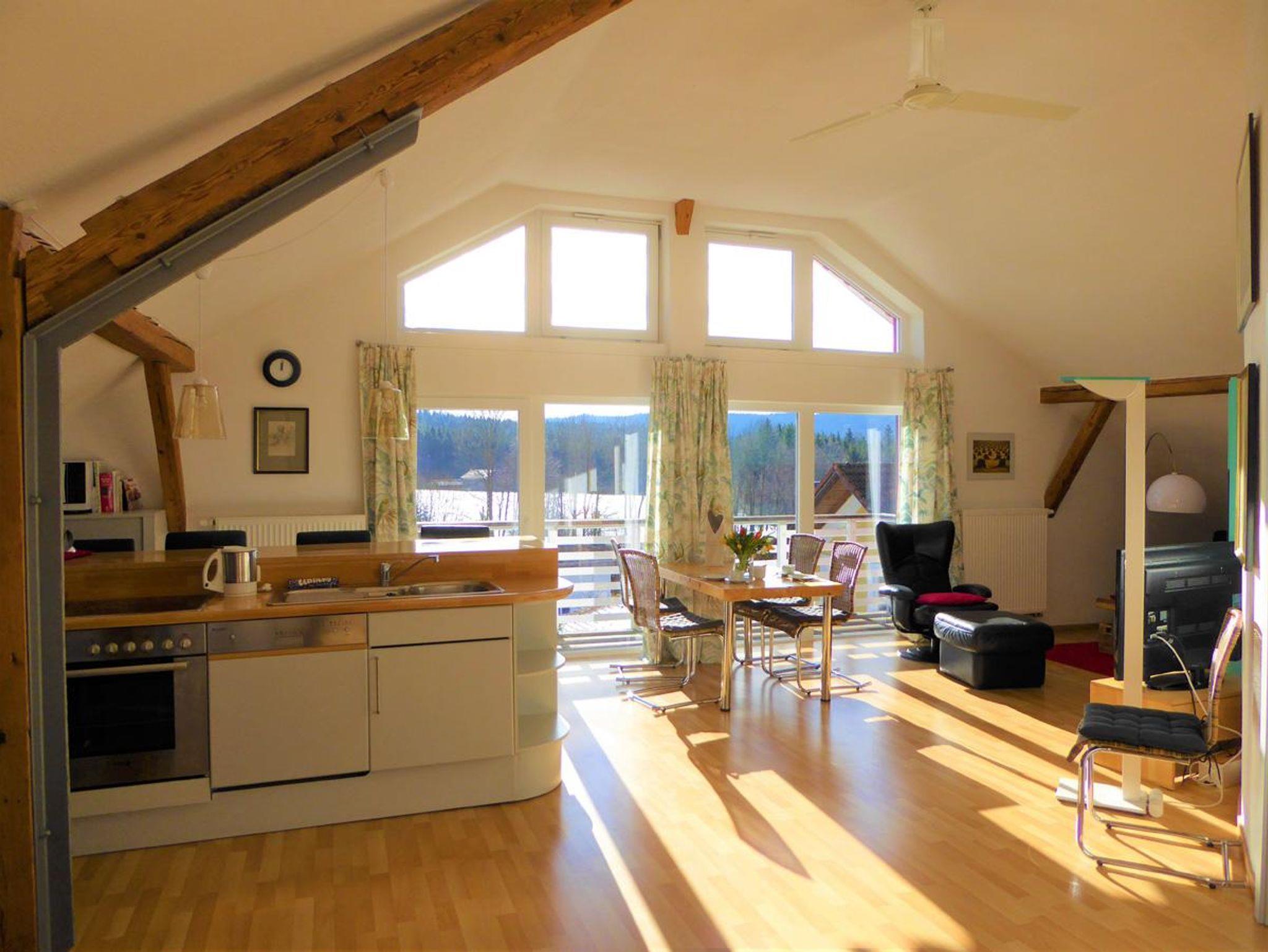 Die helle, großzügige Ferienwohnung Galerie (93 qm) bietet Platz für 4-5 Personen (mit Zustellbett). Diese Ferienwohnung befindet sich im Dachgeschoß und wirkt durch den hohen, offen Dachstuhl ausgesprochen großzügig. Im hohen und offenen Wohn- und Esszimmer mit geschwungenen Wänden stehen eine komplett ausgestattete Küchen-Insel mit Spülmaschine, Herd/Backofen, Kühl-/Gefrierkombination, Toaster, Mixer, Eierkocher, Mikrowelle, Kaffeemaschine, Kaffeepadautomat und Wasserkocher. Am Altholz-Esstisch direkt an der großen Fensterfront können 4 Personen gemütlich essen oder an der Küchentheke auf den Barstühlen. Zum Wohnbereich gehören zwei sehr bequeme Sessel mit Hocker und eine Couch mit kleinem Tisch. Ein großer SAT-TV und DVD-Player, Radio mit CD-Player, iPod- oder iPhone-Dock gehören ebenfalls zu dieser Ferienwohnung. Durch die große Glasfront, die zum Balkon führt, ist der Raum lichtdurchflutet. Im großen Schlafzimmer mit Dachfenster steht ein Doppelbett, ebenso im kleineren Schlafzimmer mit Fenster und Durchgang zum Bad. Das Bad ist mit Regendusche, Badewanne, Kosmetikspiegel und Föhn ausgestattet. Außerdem gibt es zwei separate WCs. Auf dem Balkon mit Markise können 2 Personen sitzen und den schönen Blick auf die umliegenden Berge und Wiesen genießen. Zur Wohnung gehört ein abschließbarer Kellerraum für Fahrräder oder Ski im Carport