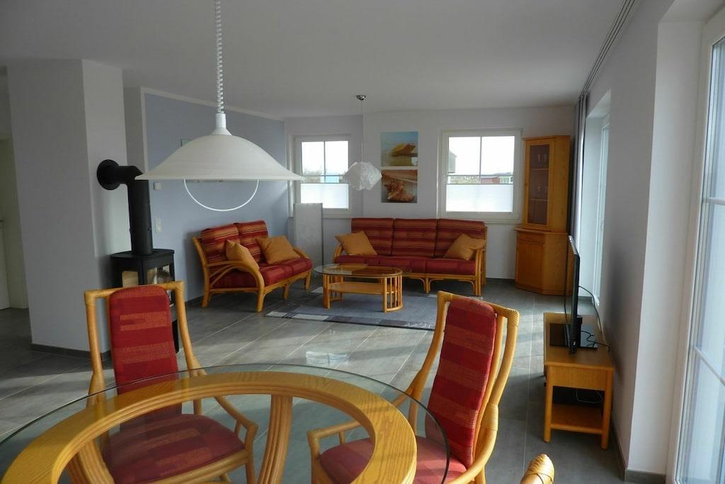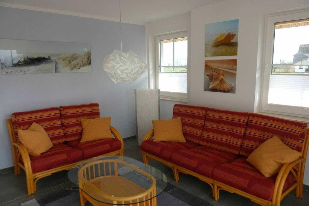 Ferielejligheden Seeigel i stueetagen med et boligareal på 66 kvadratmeter er ideel til 2 voksne og et barn. Lejligheden har en stor, attraktiv stue med et moderne, fuldt udstyret køkken, spiseplads, siddeområde, pejs og LCD-tv. Soveværelset har en dobbeltseng. Det smukt designede badeværelse har et rummeligt brusebad. Terrassen fører ud til haven, som er møbleret med grill, havemøbler og liggestole, perfekt til afslapning. Huset tilbyder en fantastisk udsigt over havet og øen Hiddensee. Ekstra senge, kæledyr, alternative ankomsttider eller kortere ophold er tilgængelige efter anmodning.